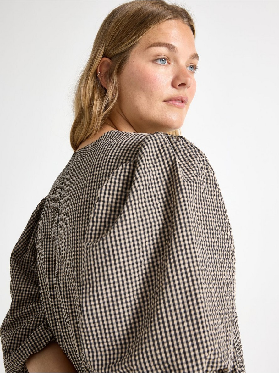 Midi haljina od seersucker tkanine, opuštenog kroja sa puf rukavima.