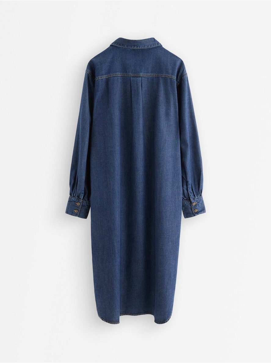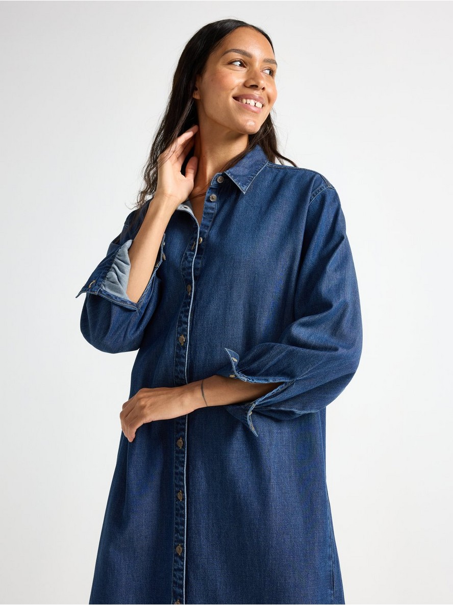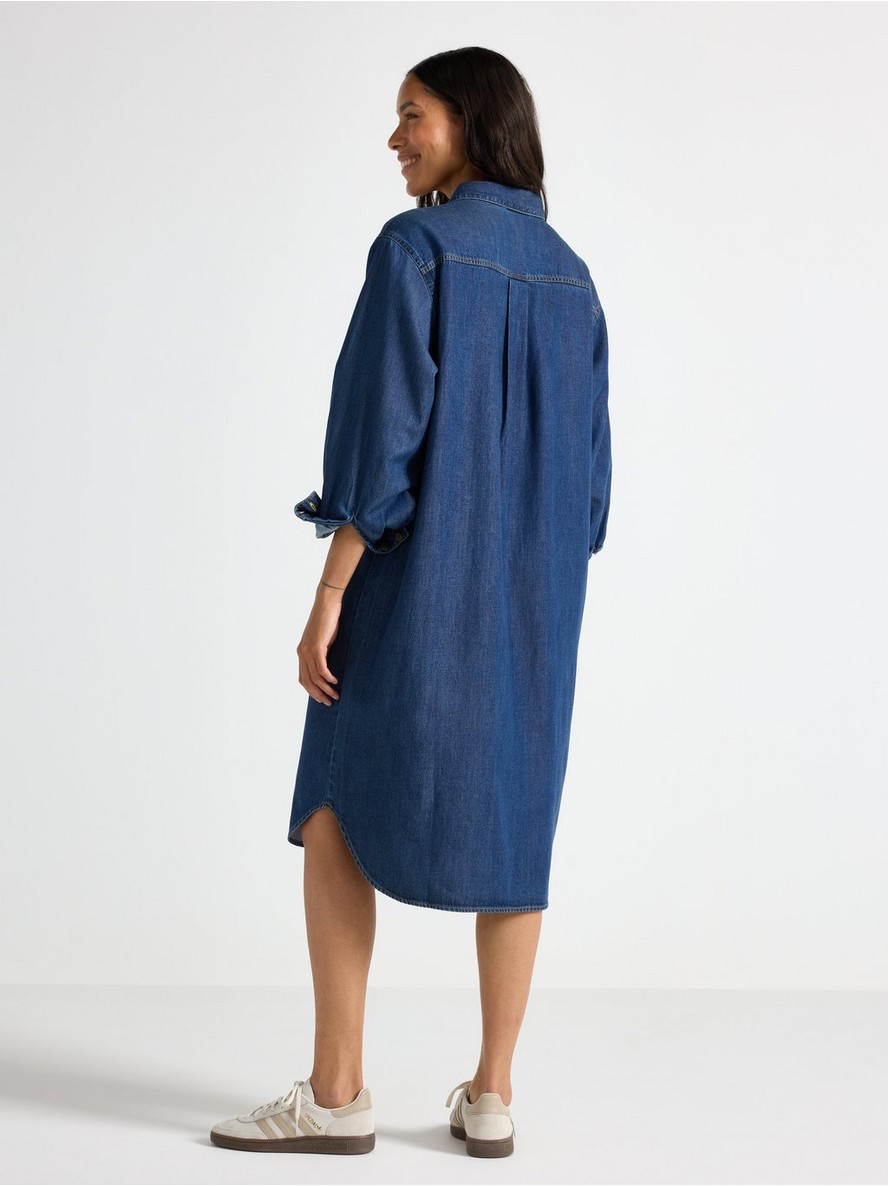 Midi košulja-haljina opuštenog kroja, sa zakopčavanjem na dugmad i ovratnikom.