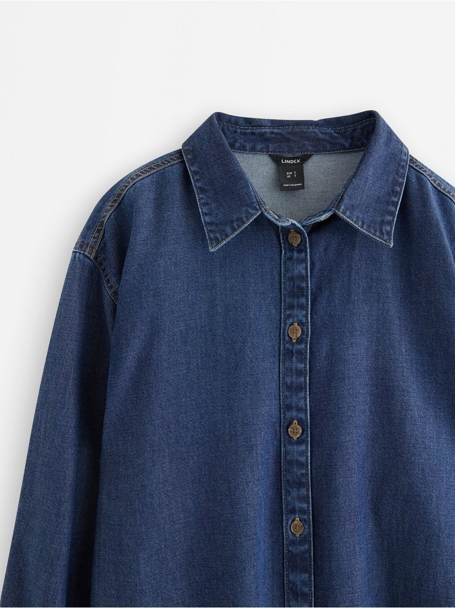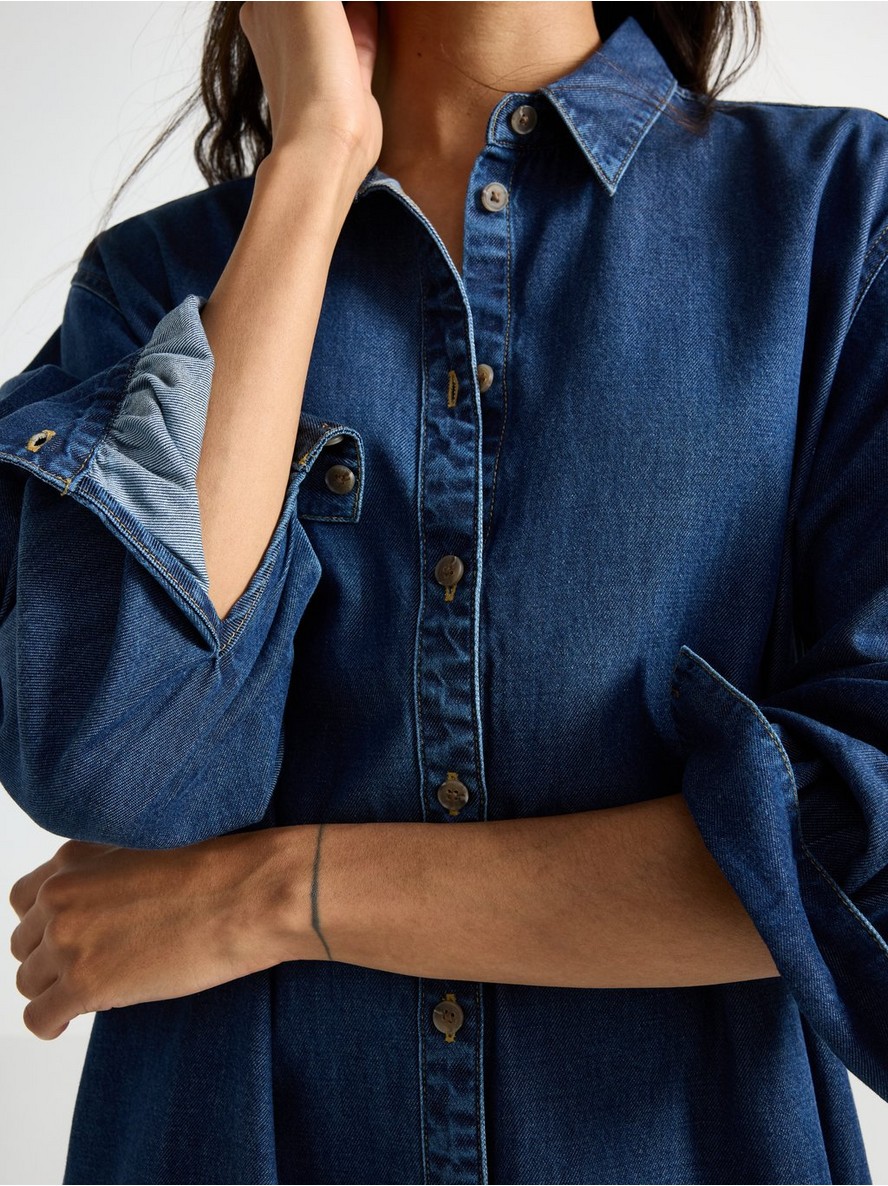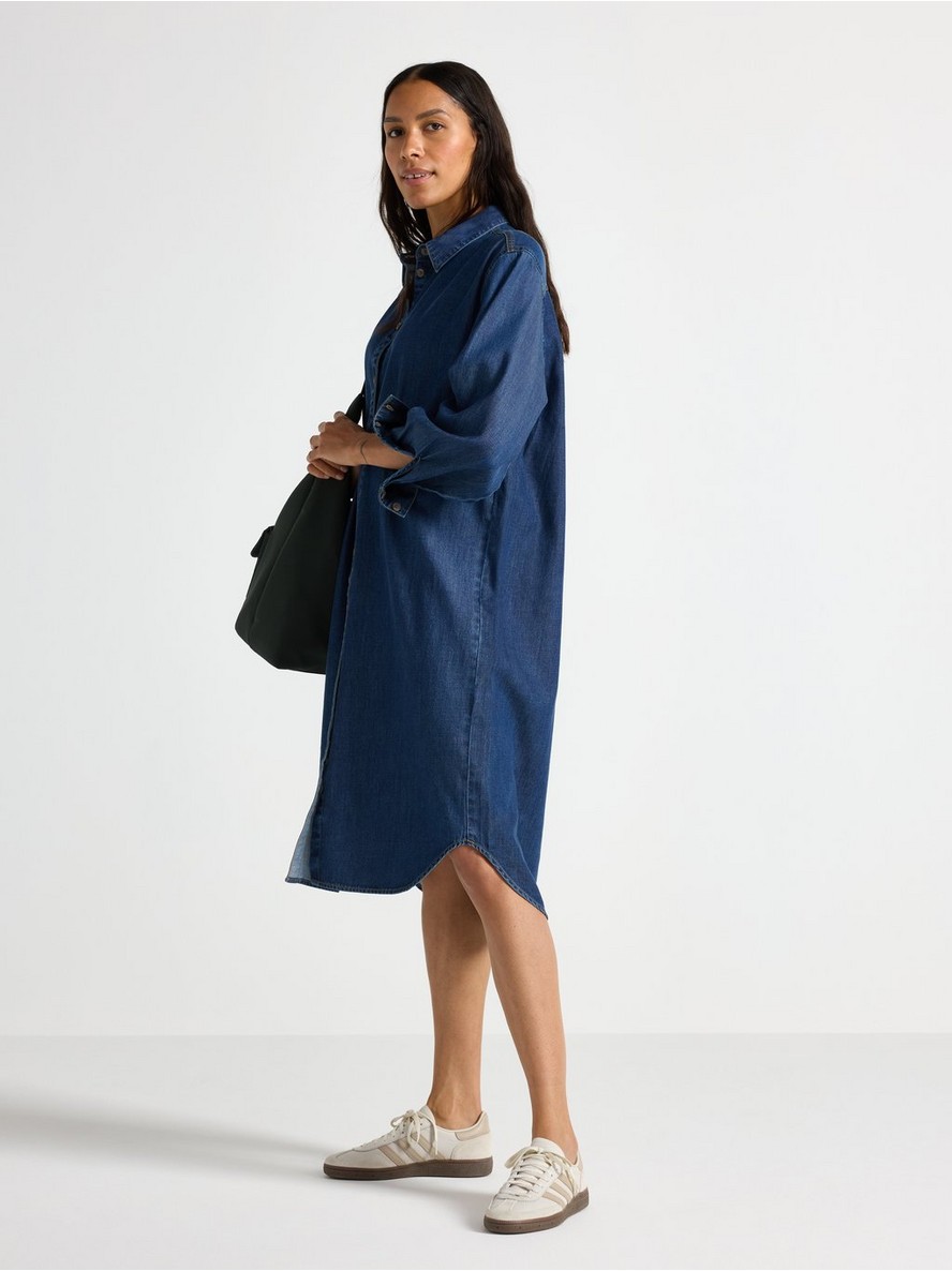 Midi košulja-haljina opuštenog kroja, sa zakopčavanjem na dugmad i ovratnikom.