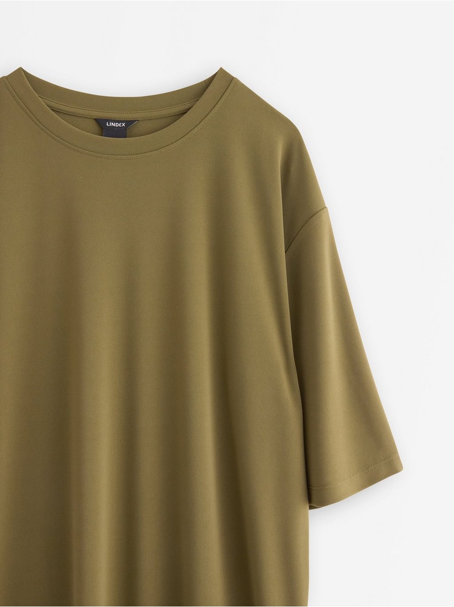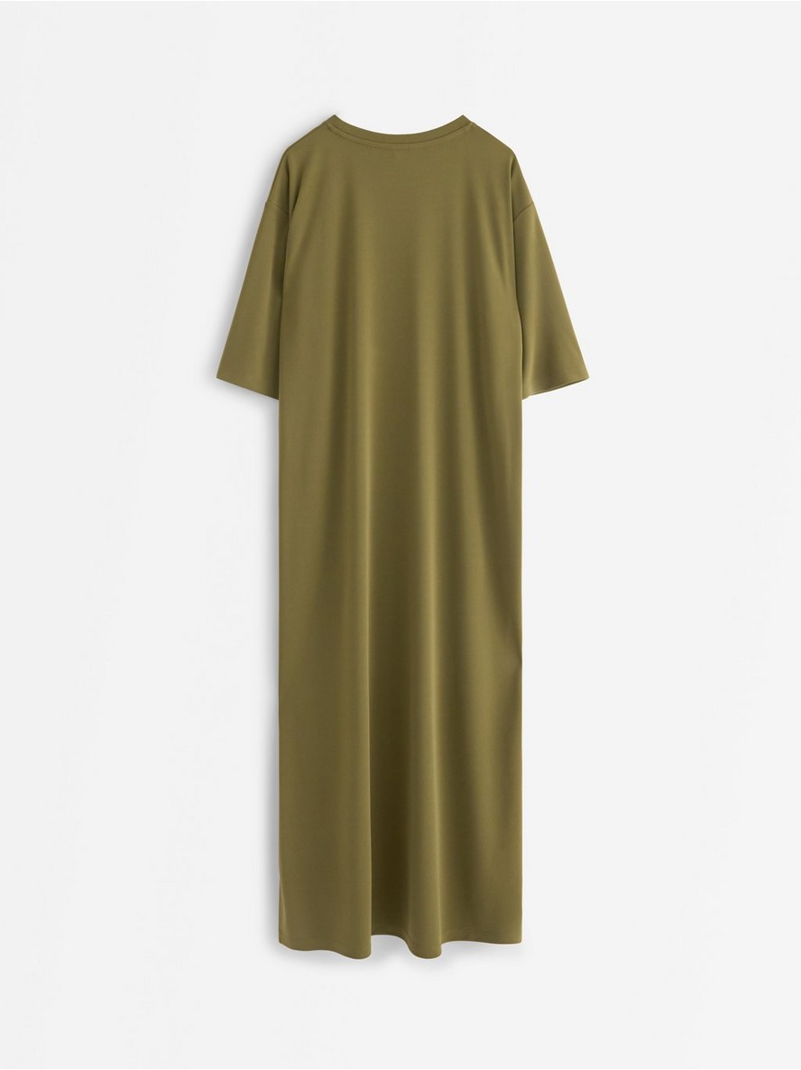 Midi majica-haljina od mekanog džersija, sa opuštenim krojem i kratkim rukavima.