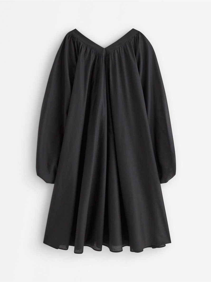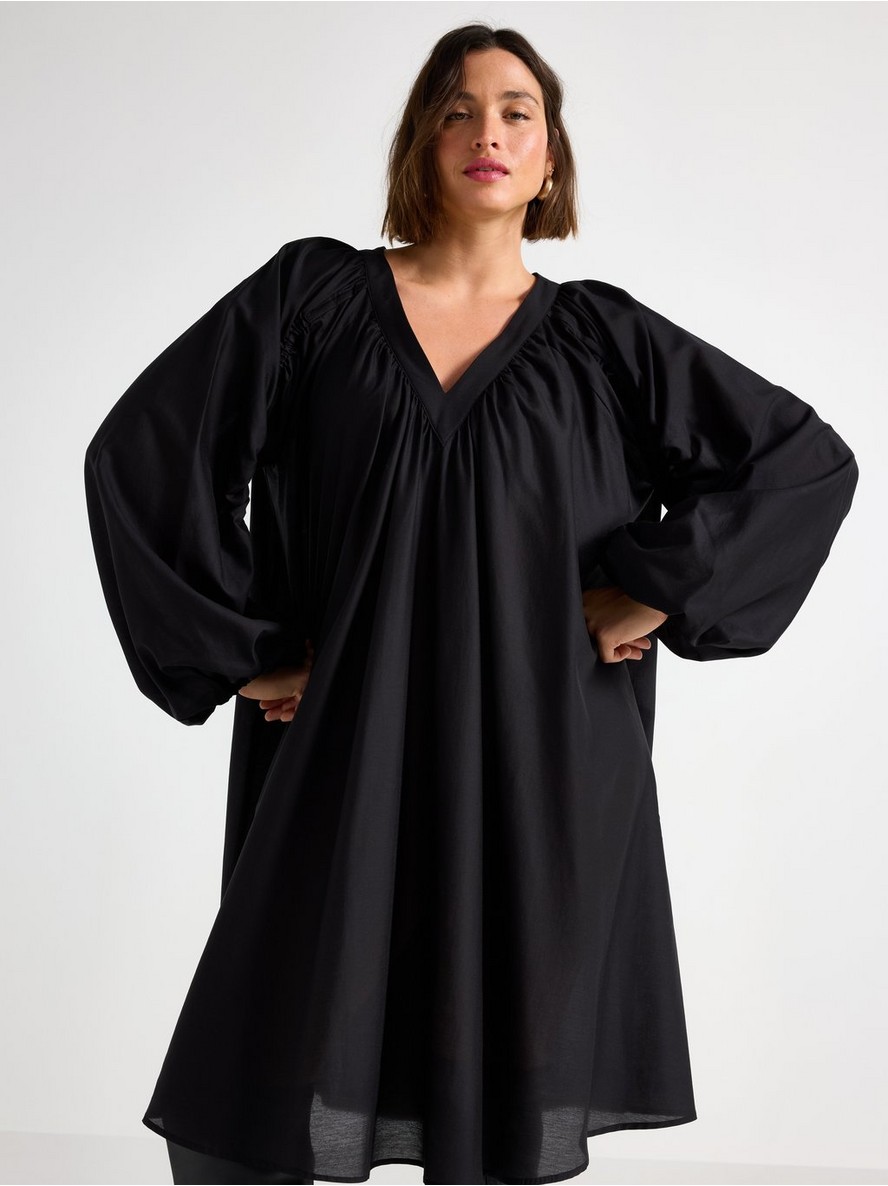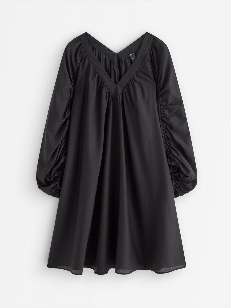 Mini haljina od tkanog materijala sa balon rukavima, V-izrezom i ležernim krojem.