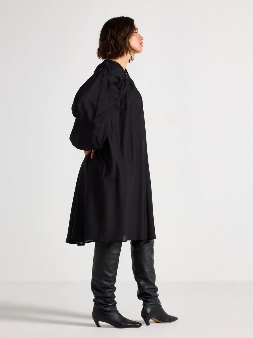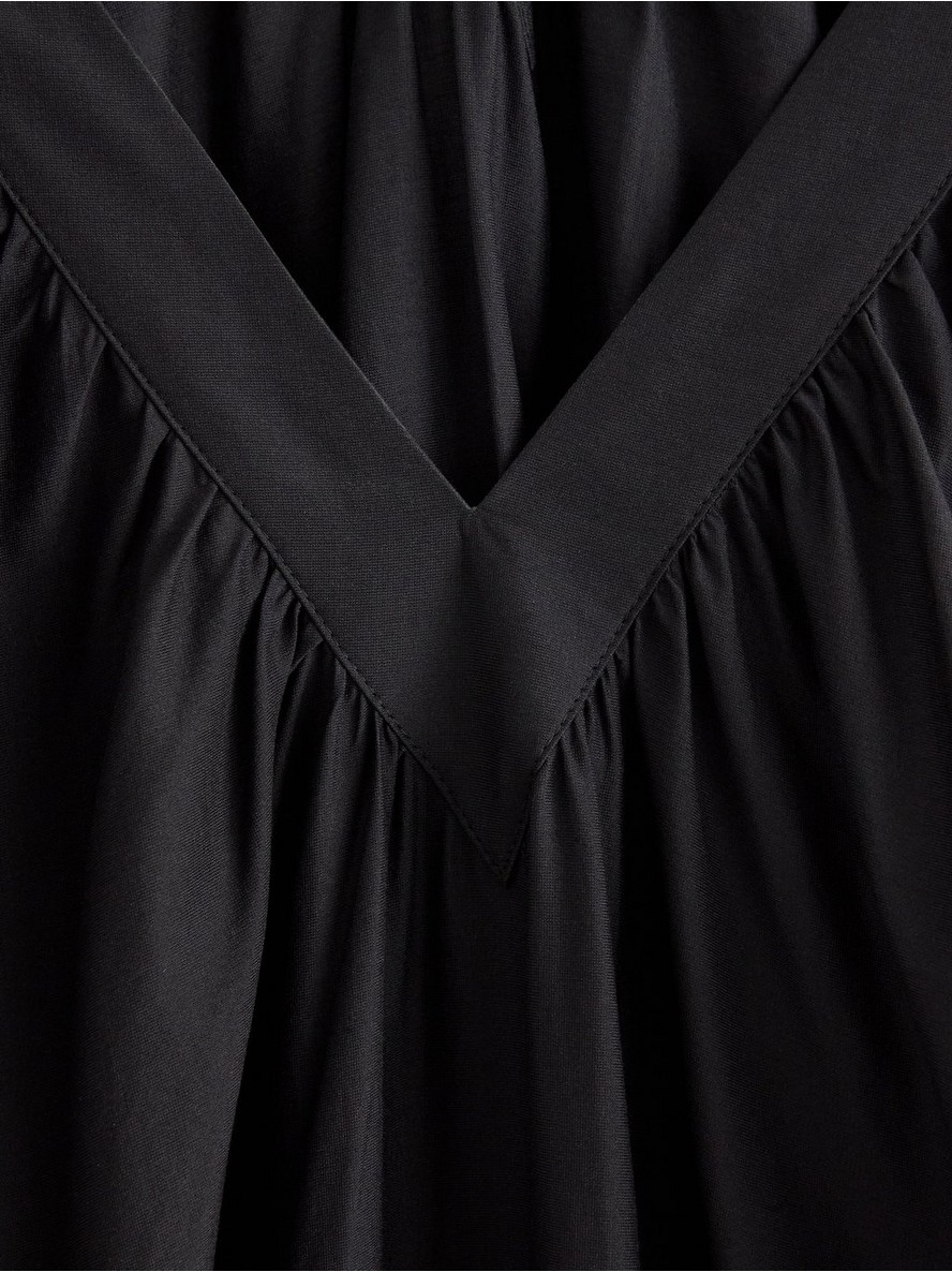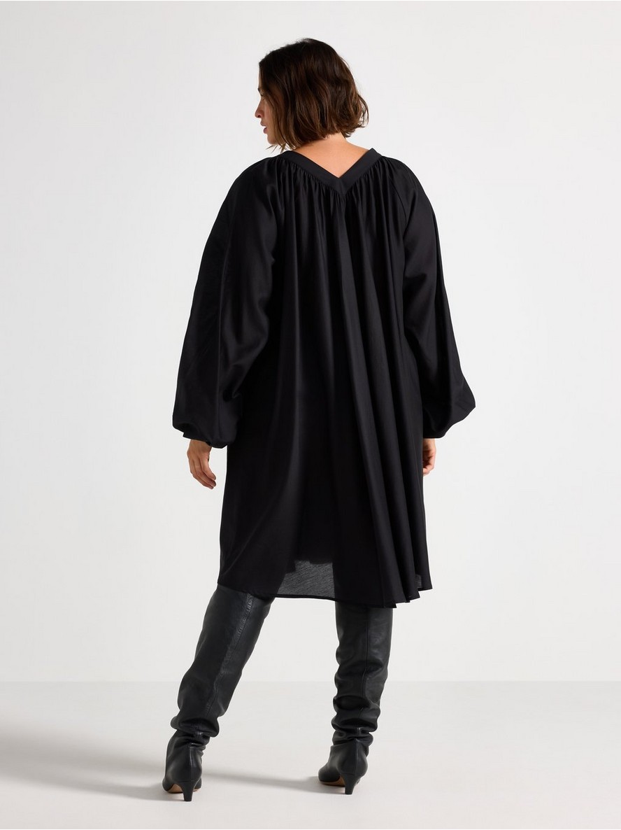 Mini haljina od tkanog materijala sa balon rukavima, V-izrezom i ležernim krojem.