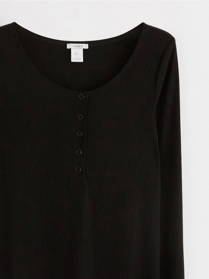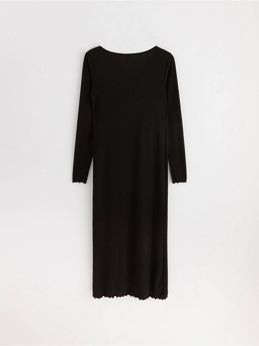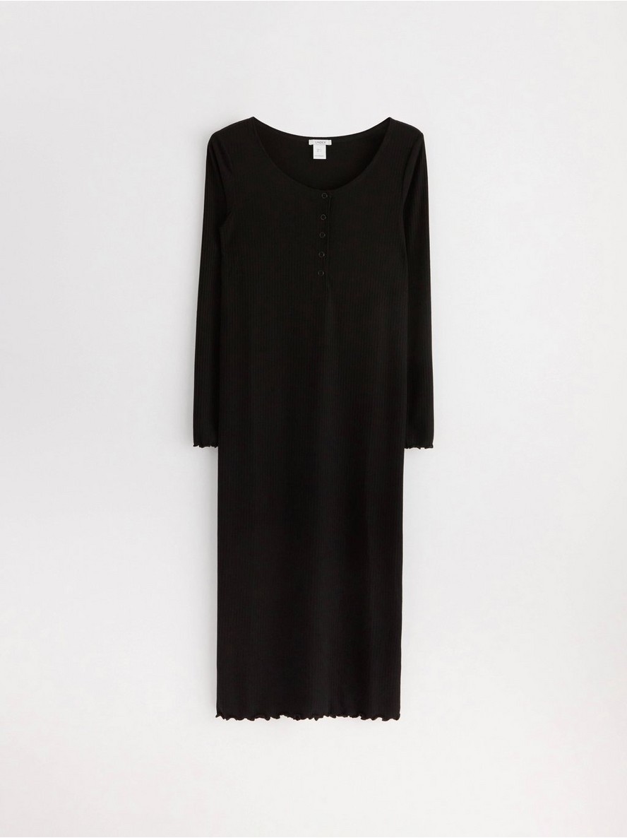 Mekana haljina dugih rukava od rebrastog, rastegljivog džerseja sa dodatnim prostorom za rastući stomak. Ima ležište za dugmad na prednjem delu i talasasti rub na donjem delu i otvorima rukava.