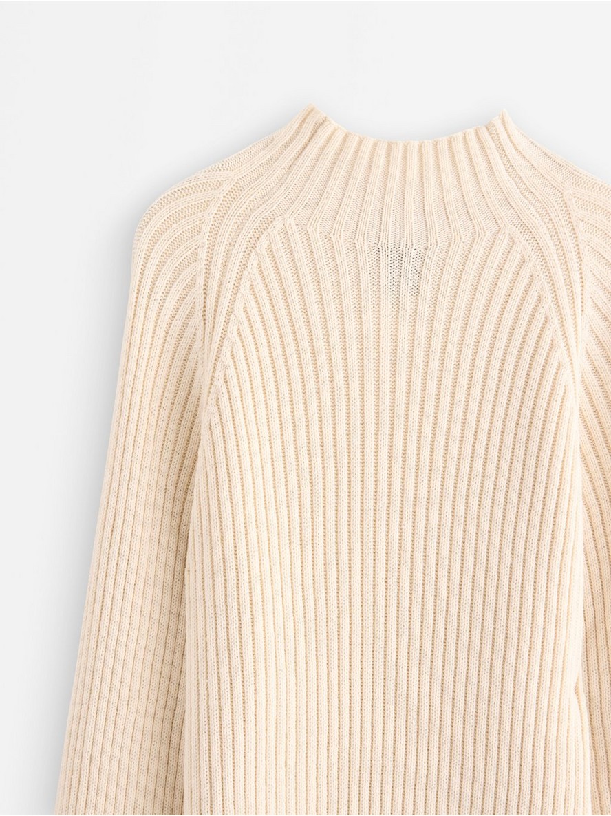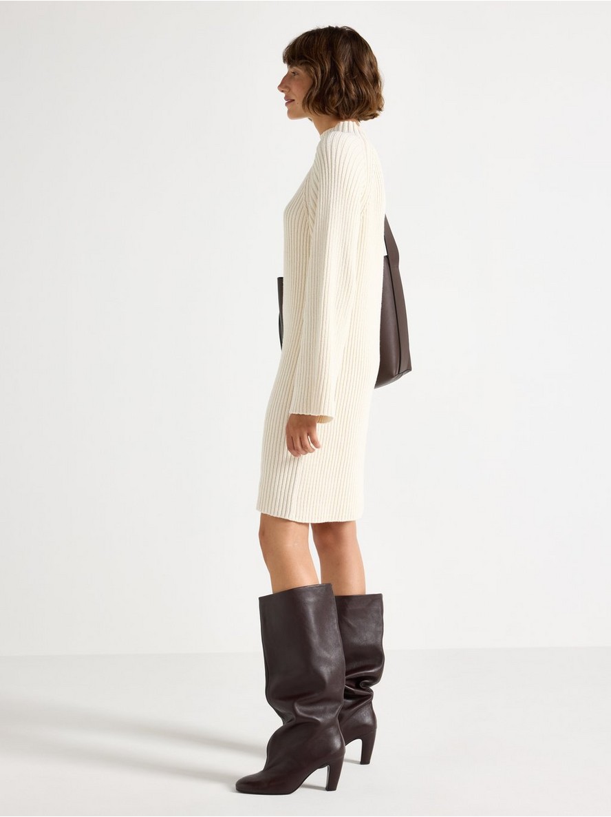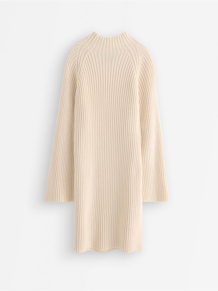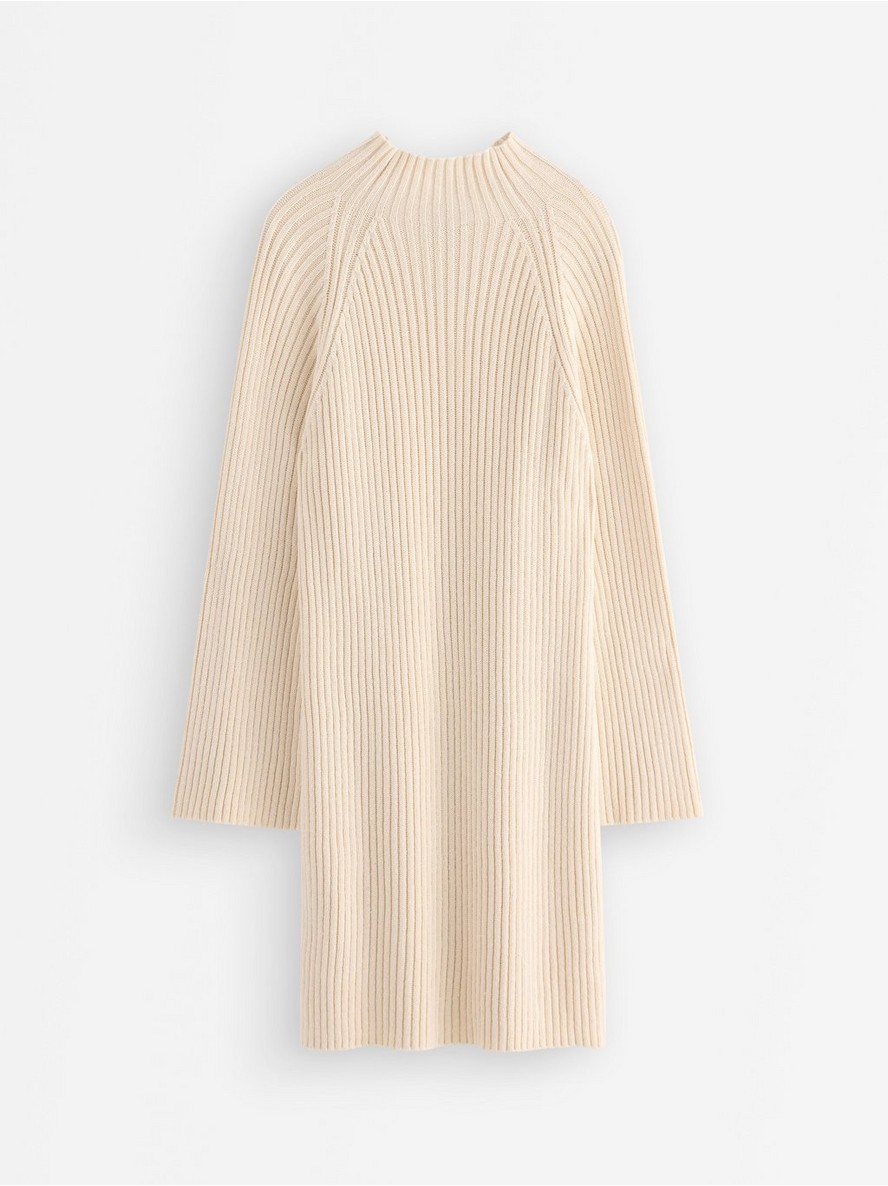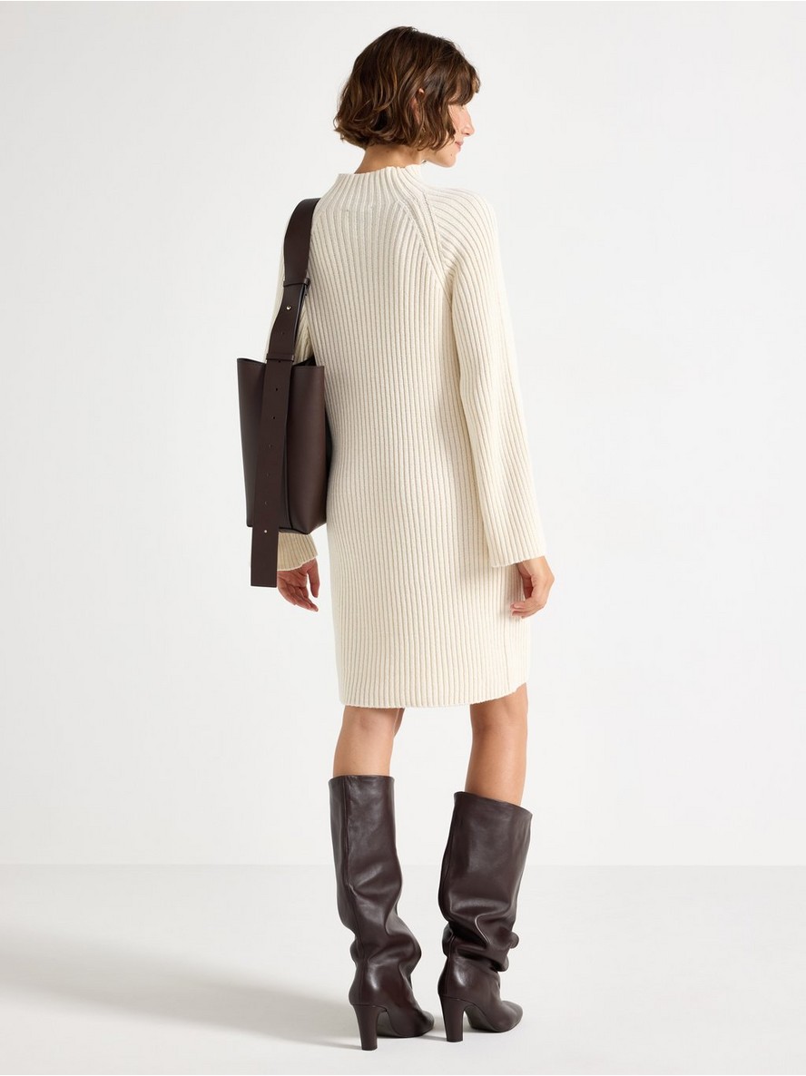 Mini haljina rebrastog pletiva sa dugim rukavima i stojećim ovratnikom.