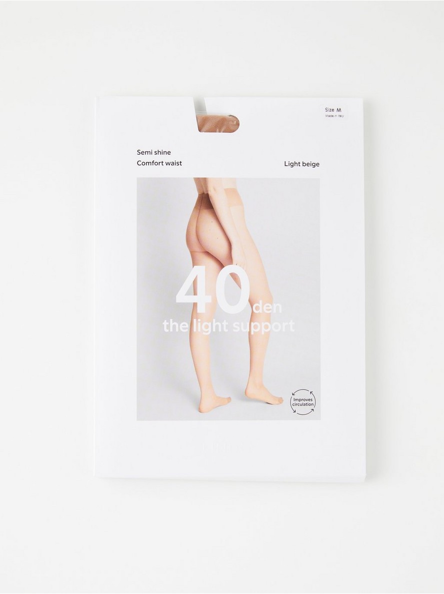 Polusjajne najlonke 40 den sa laganom potporom. Najlonke imaju udoban pojas — blago rastegljivo pletivo oko struka koje ih čini izuzetno udobnim za nošenje.