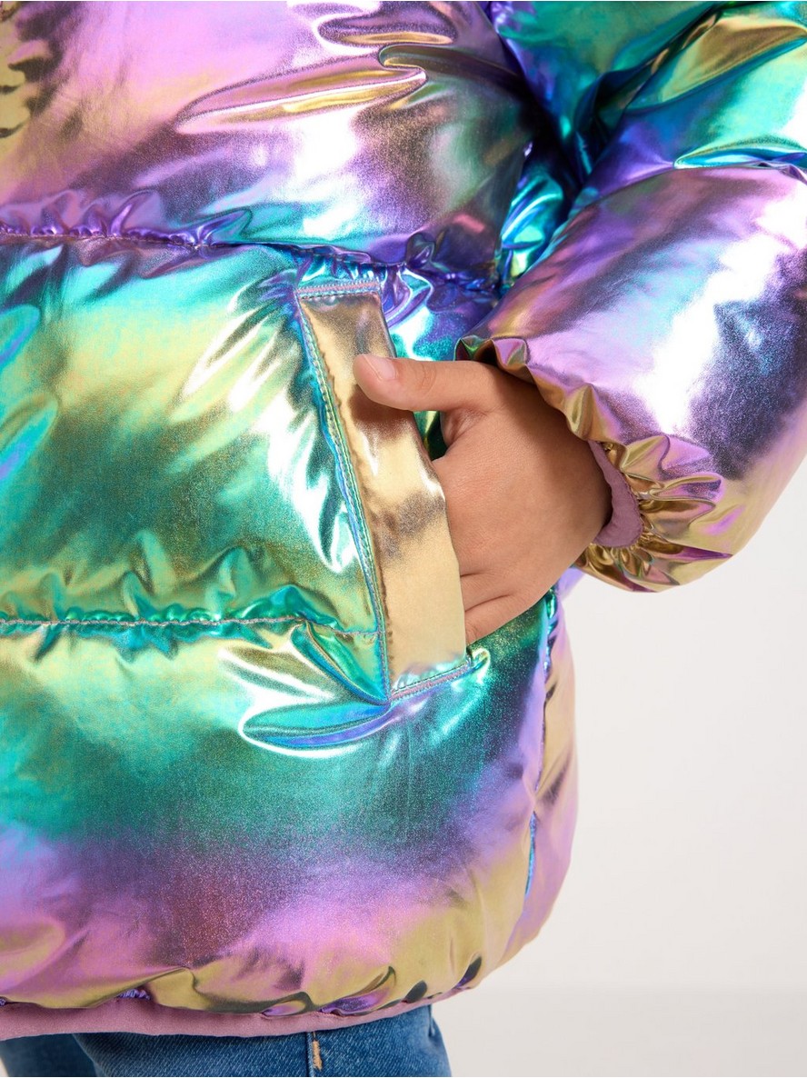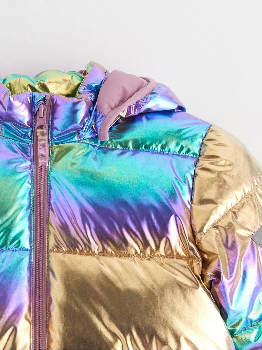 Topla jakna s punjenjem za hladnije dane sa sjajnim, holografskim finišem, patent-zatvaračem s prednje strane i uklonjivom kapuljačom.