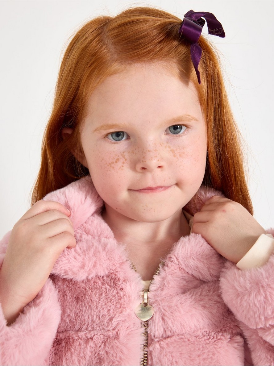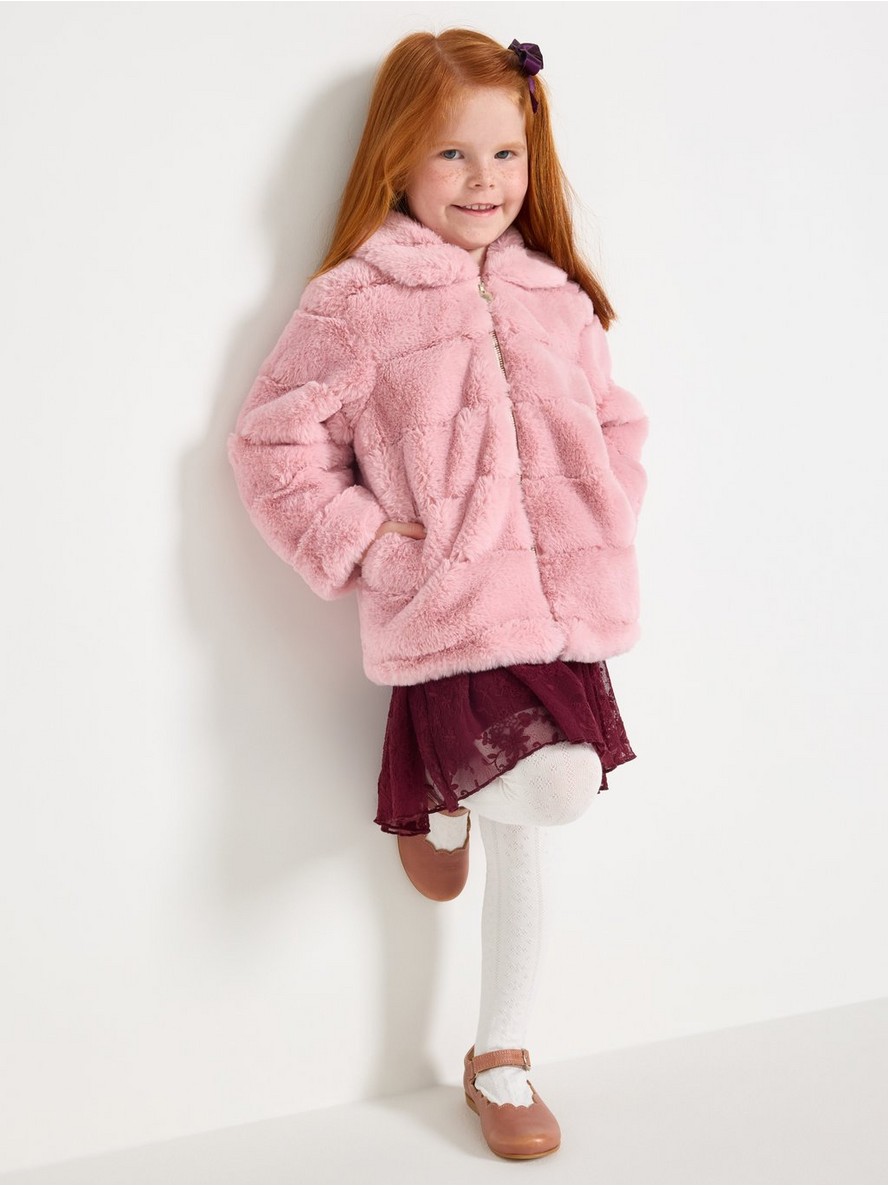 Jakna od veštačkog krzna sa ravnom siluetom i metalnim patentnim zatvaračem sprijeda, sa klasičnim okovratnikom.