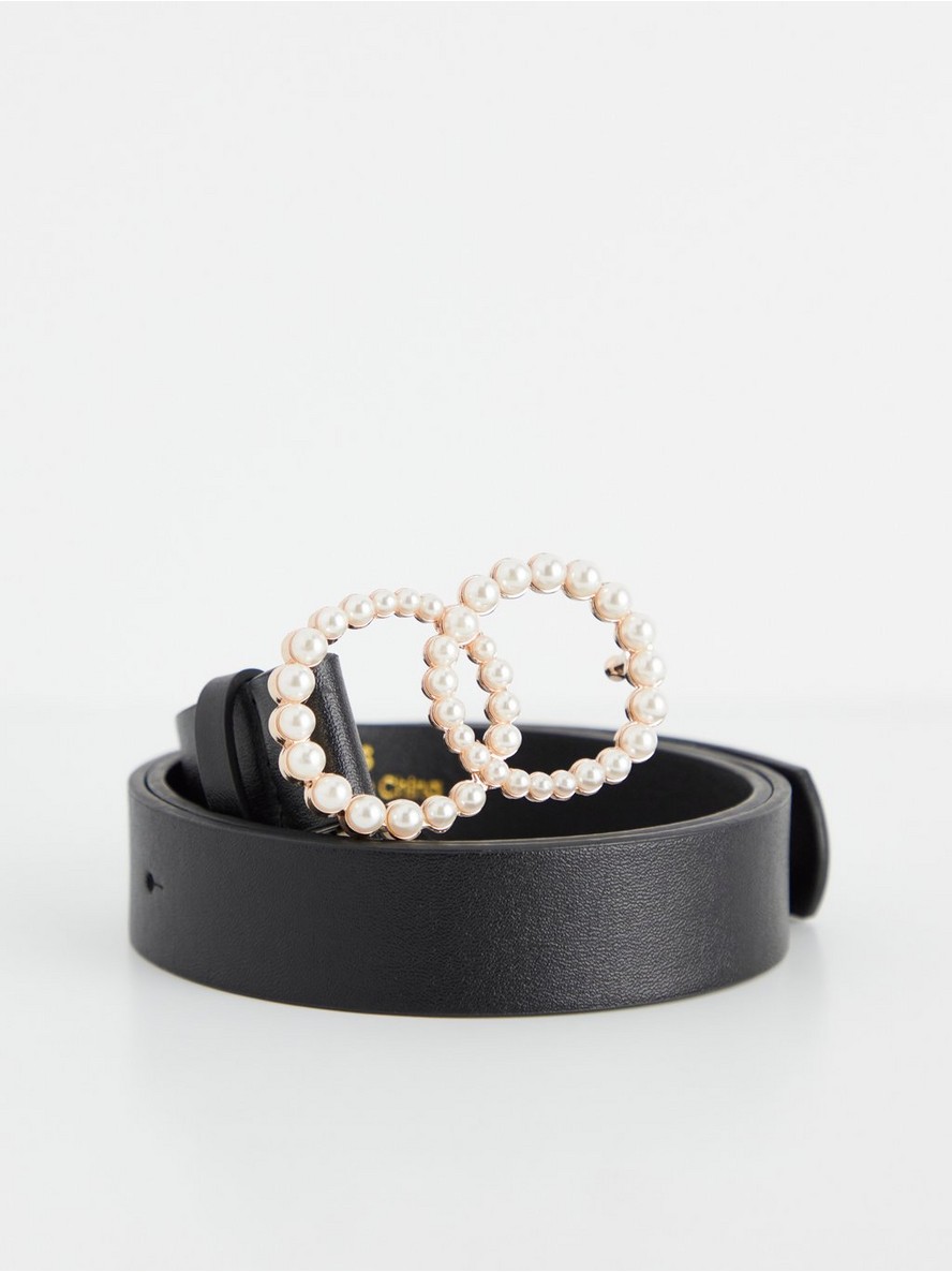 Elegantni kaiš od veštačke kože, sa zlatnom dvostrukom kopčom u obliku prstena ukrašenom biserima.