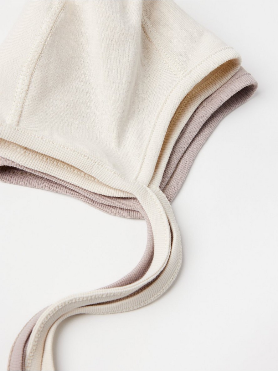 Dve kapice za bebe od mekanog pamučnog džerseja sa trakicom za vezivanje kako bi ostale na mestu.
