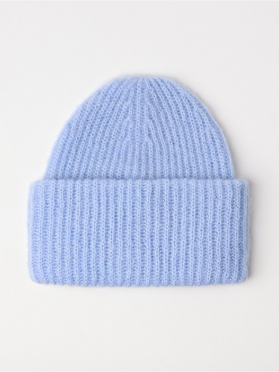 Mekana kapa rebrastog pletenja od mešavine vune sa široko preklopljenim rubom.