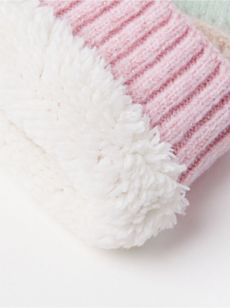 Mekana rebrasto pletena kapa sa pom-pomom od veštačkog krzna i u duginim bojama.
