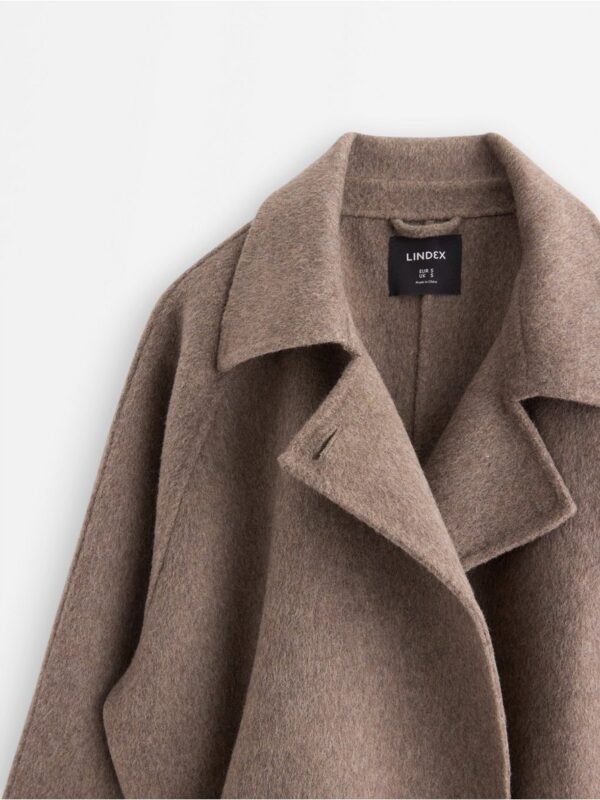 Coat in wool blend with tie belt to waist and pockets to front.