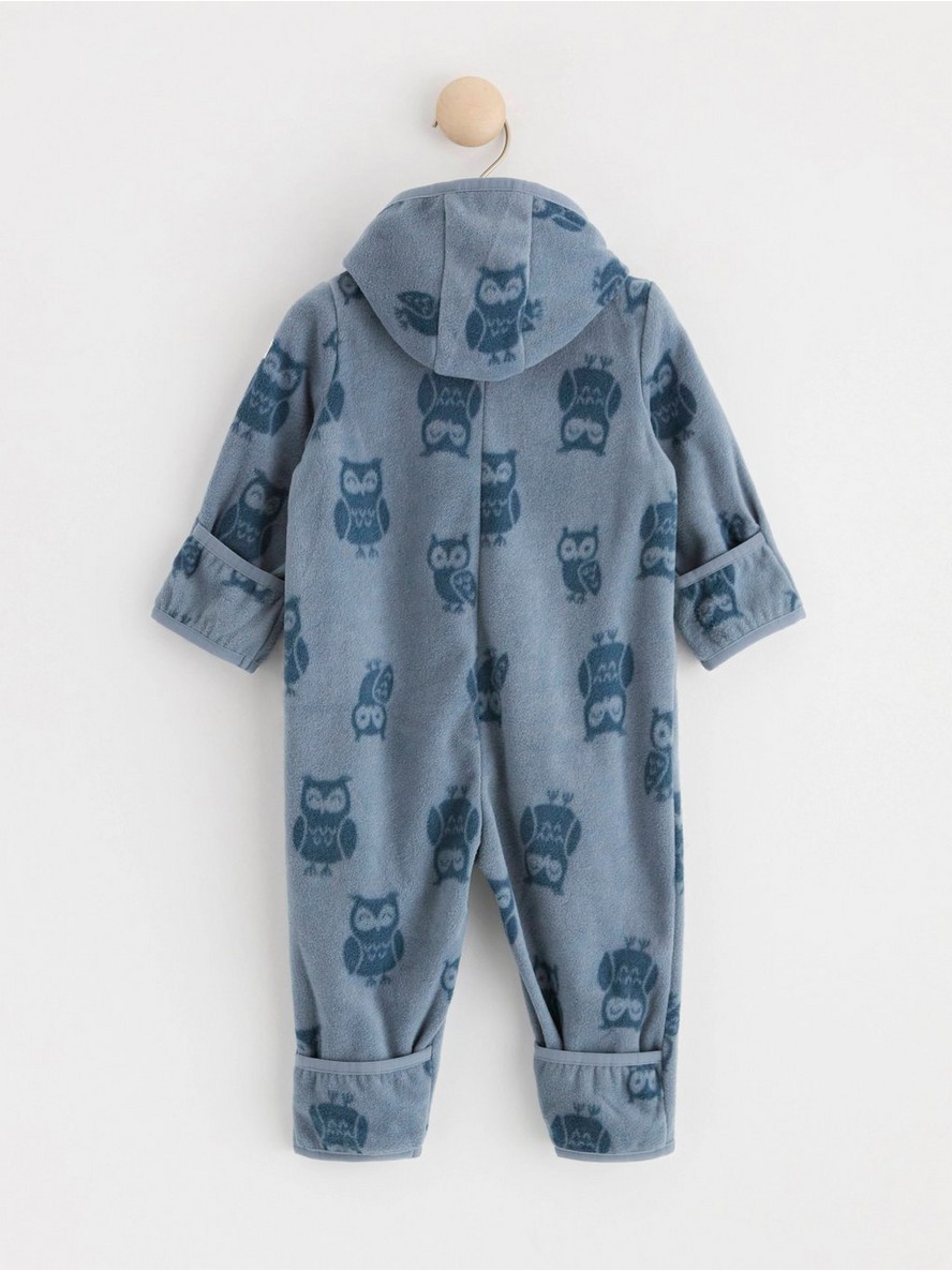 Bez postave, mekani kombinezon od flisa sa preklopivim završecima na rukavima i nogavicama, rajsferšlusom napred koji se spušta niz jednu nogavicu i kapuljačom.