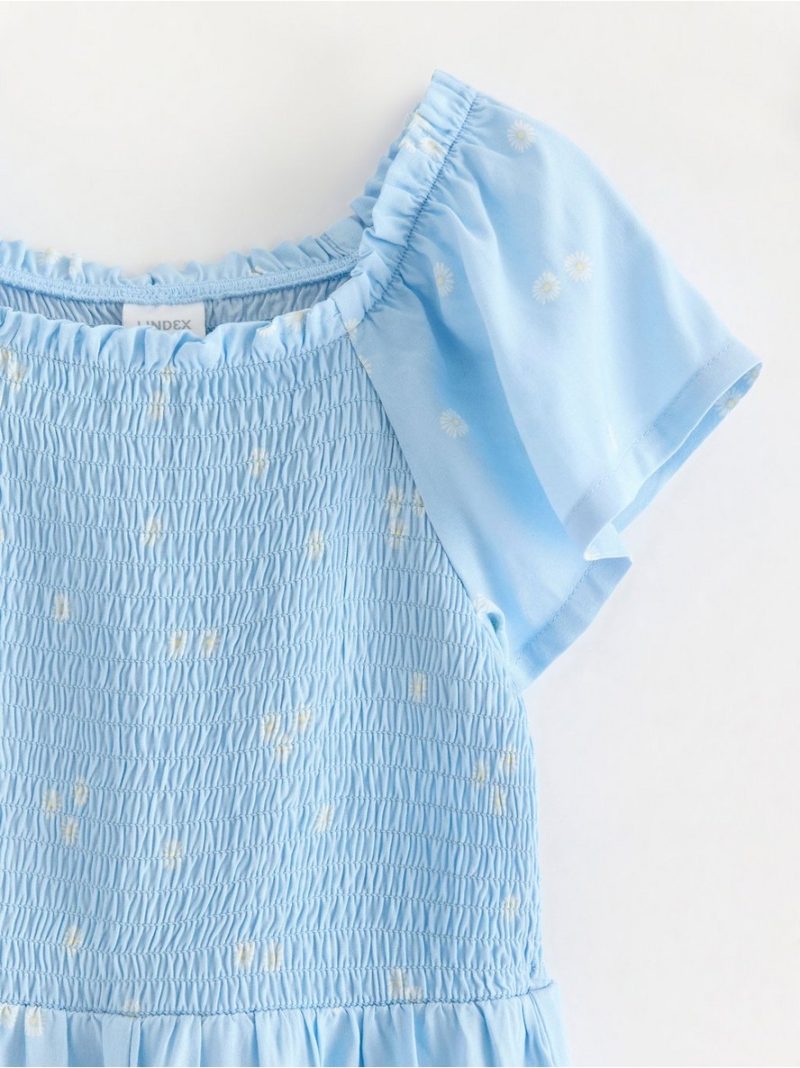 Kombinezon od tkanog materijala sa nabranošću u gornjem delu (smock) i širokim nogavicama.
