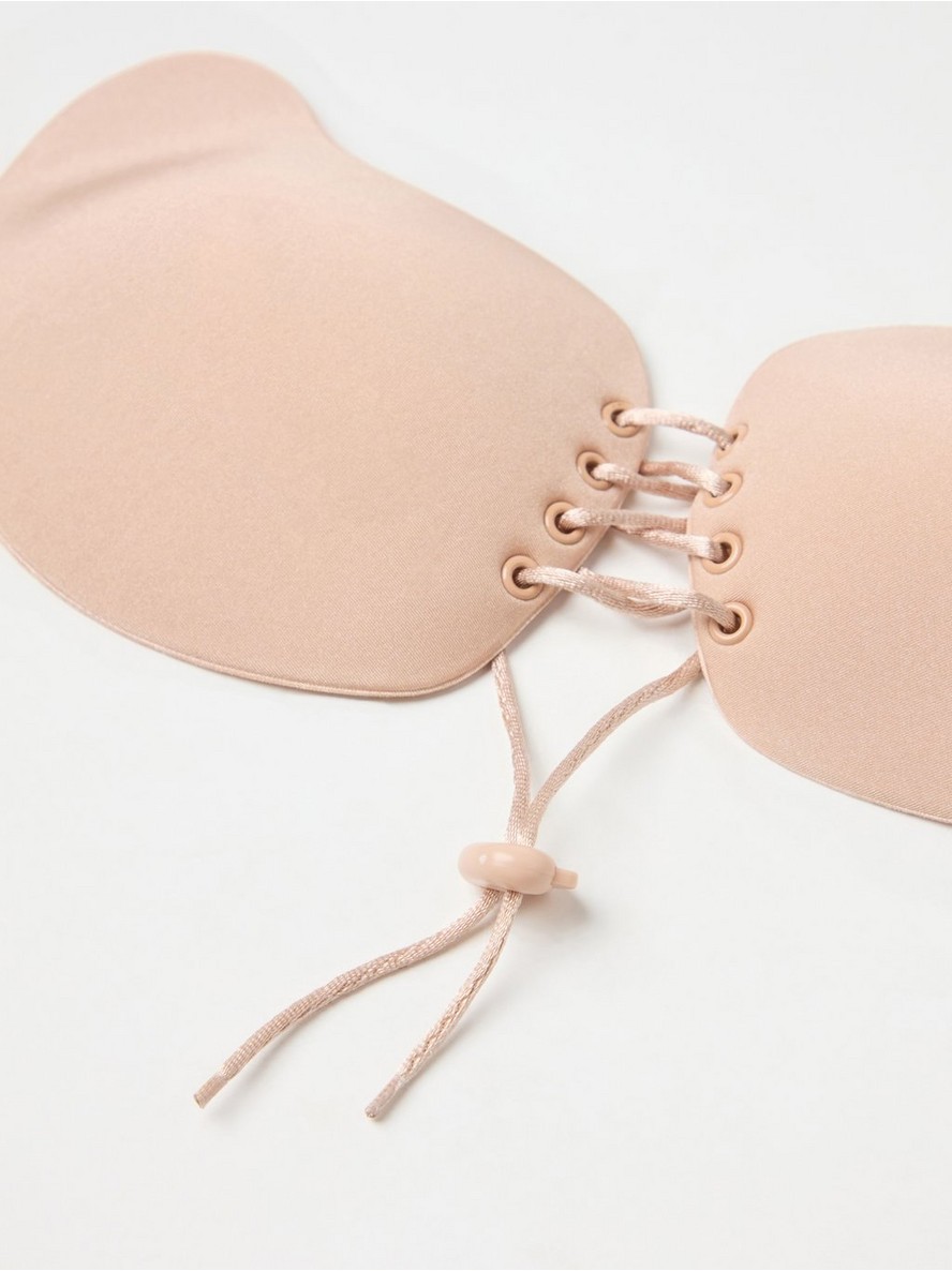 Inovativan grudnjak bez naramenica i bez leđa sa samolepljivim čašicama i pertlanim dizajnom u sredini koji omogućava podešavanje dekoltea. Savršen za komade sa otvorenim leđima, topove bez ramena i svečane haljine.