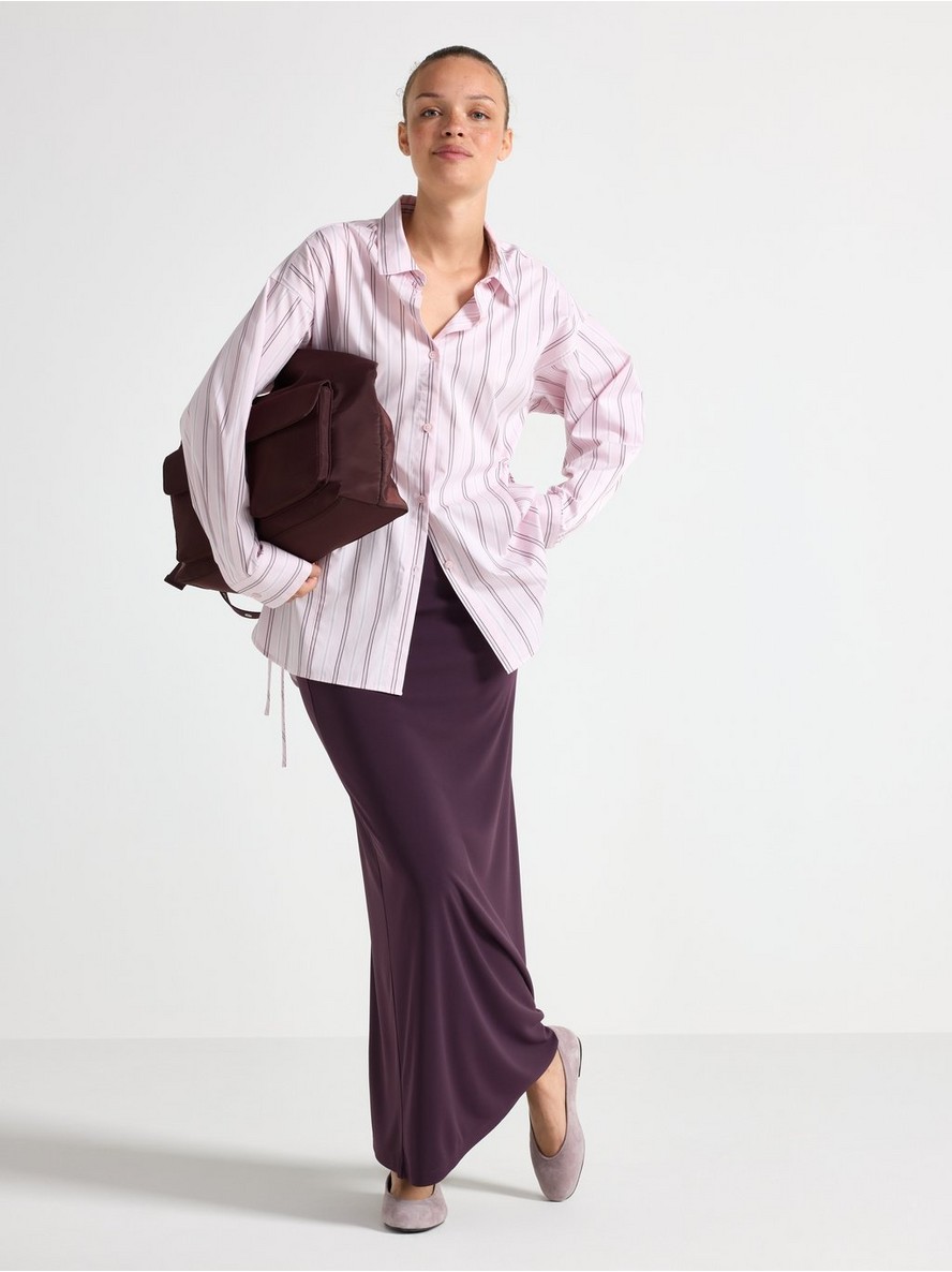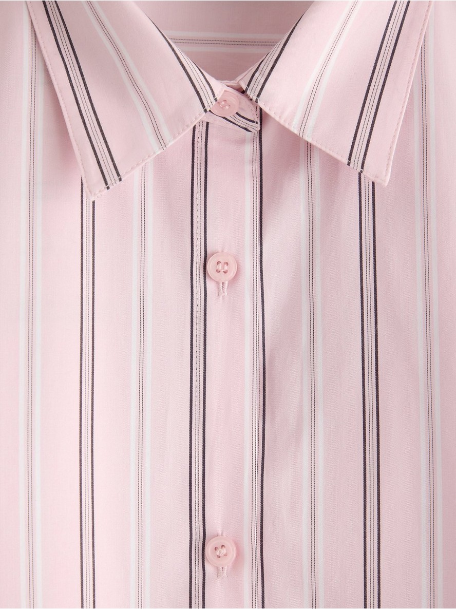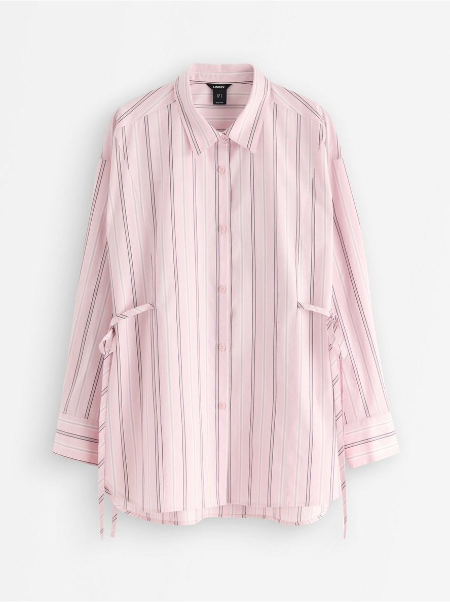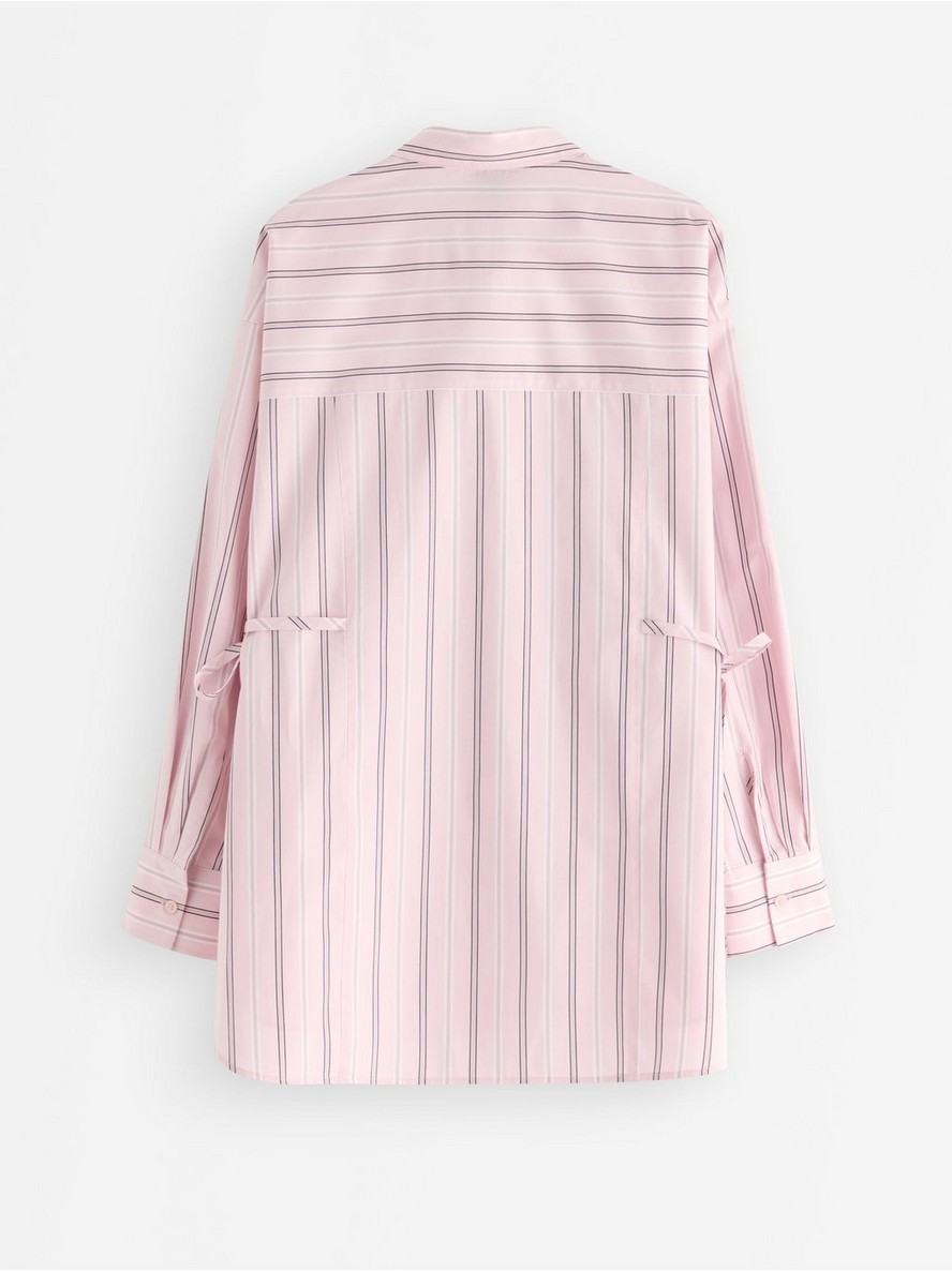 Duga prugasta košulja sa kopčanjem na dugmad i pojasom za vezivanje na obe strane.