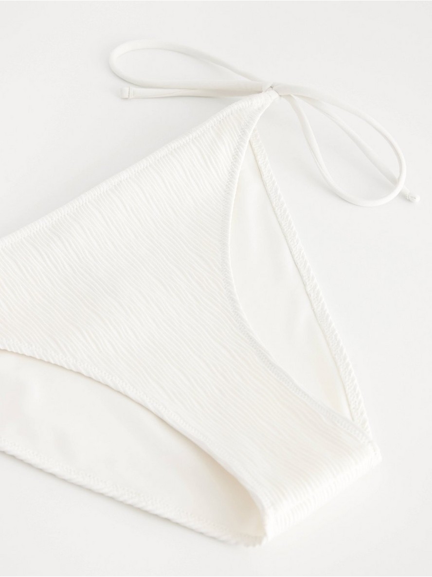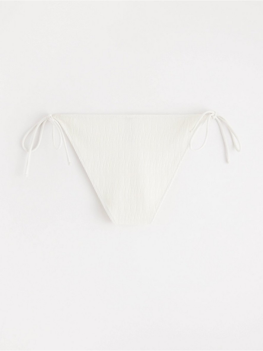 Mekan donji deo bikinija sa trakama za vezivanje i teksturom po celoj površini.