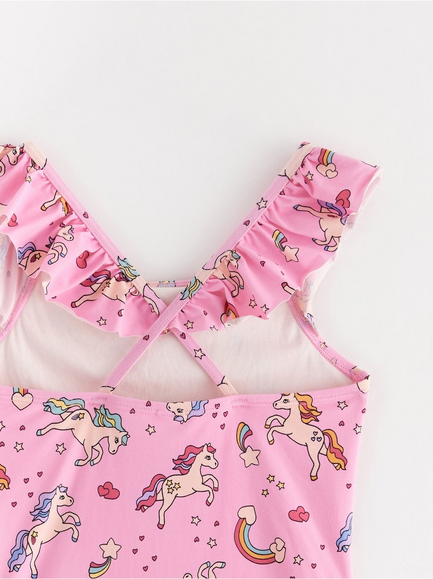 Kupaći kostim s ukrštenim naramenicama na leđima i šarenim dezenom.