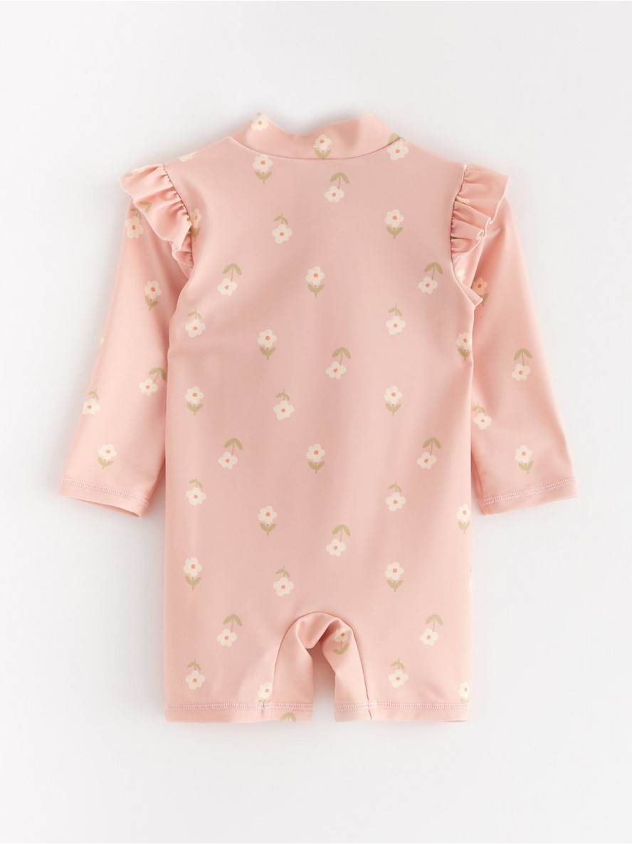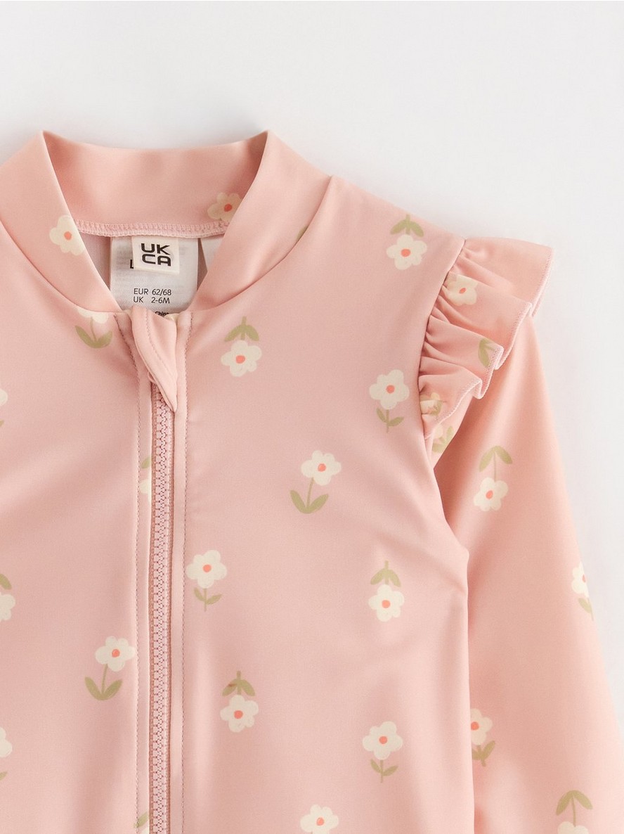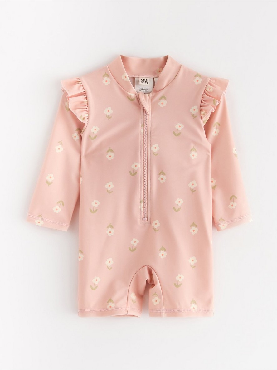 Kupaći kostim od tkanine sa UV zaštitom i dugim rukavima. Na prednjem delu se nalazi zatvarač.