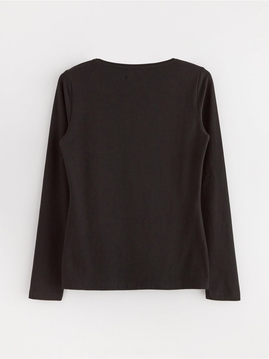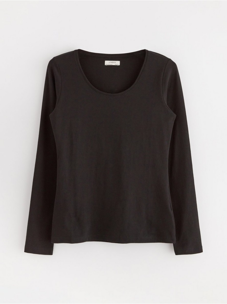 Ženski top regular kroja od pamučne mešavine, sa dugim rukavima i okruglim izrezom. Udoban trikotažni kvalitet za svakodnevno nošenje.
