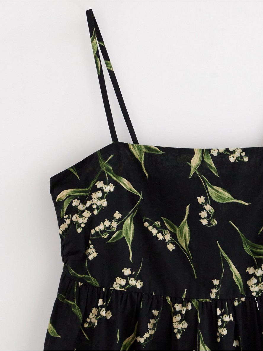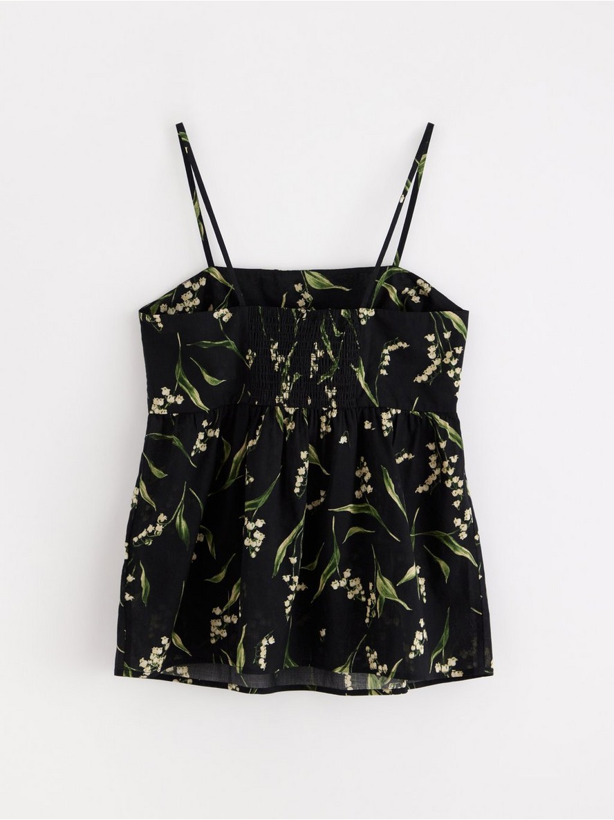 Tkani pamučni top na bretele sa tankim naramenicama, nabranim zadnjim delom (smocking) i peplum siluetom koja se širi.