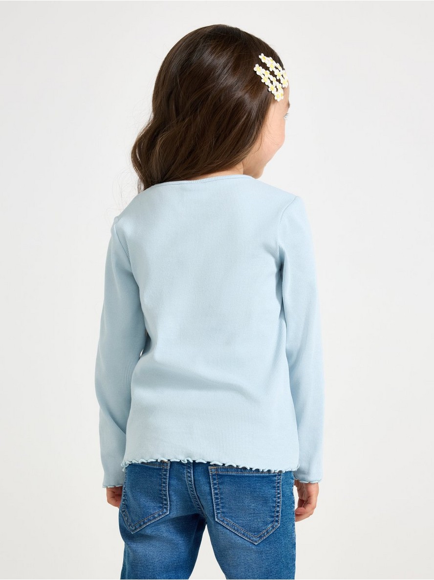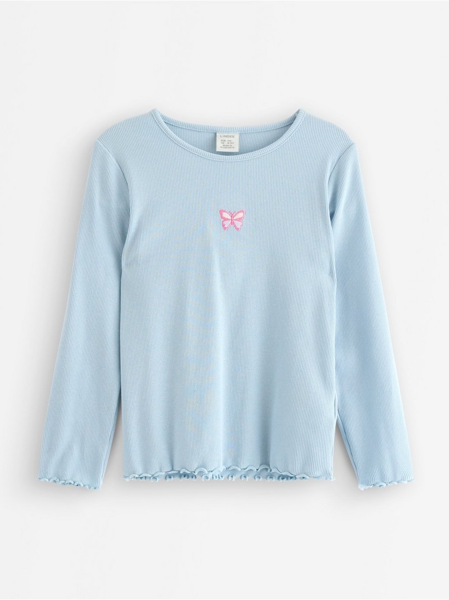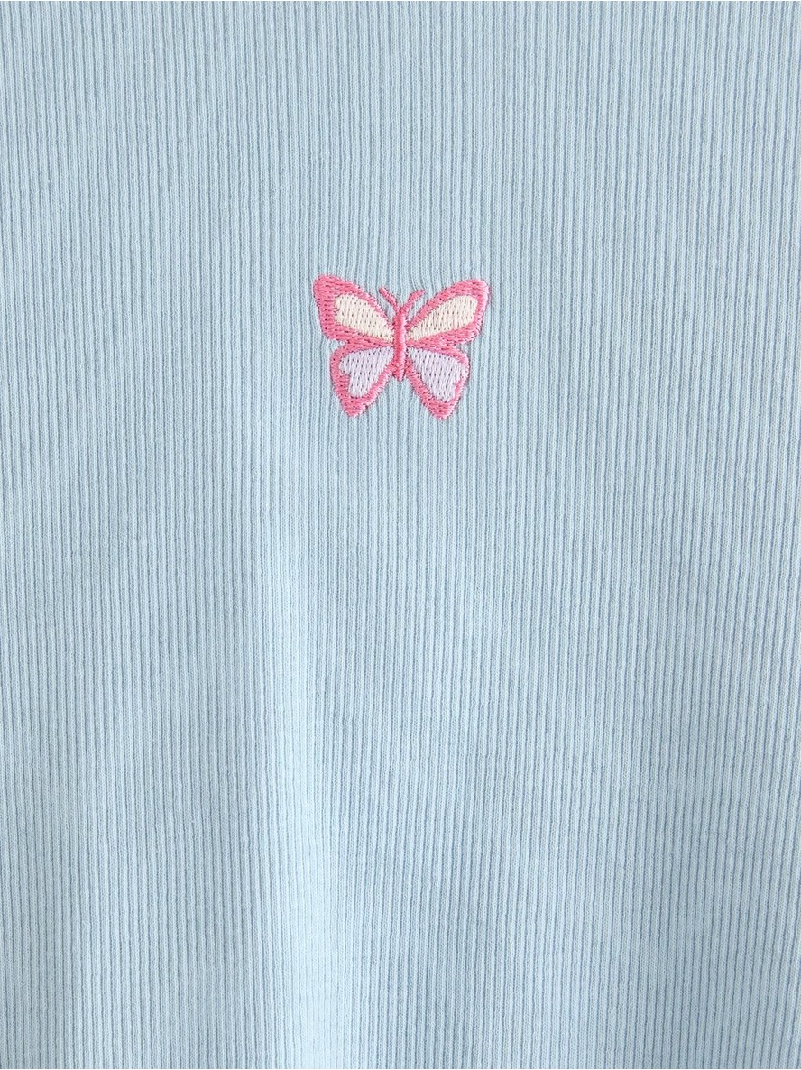 Rebrasti top od mekanog, rastegljivog pamuka, sa ukrasnim volanima i malim vezom napred.