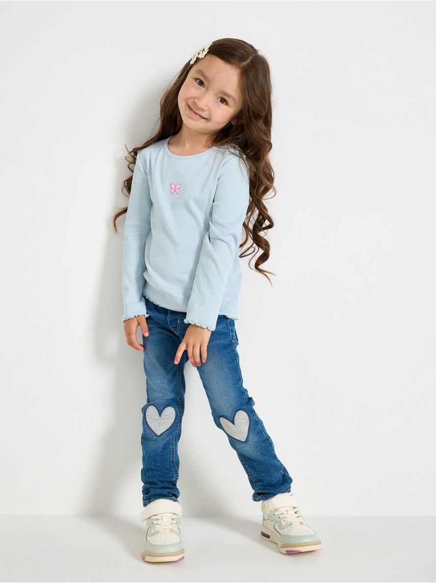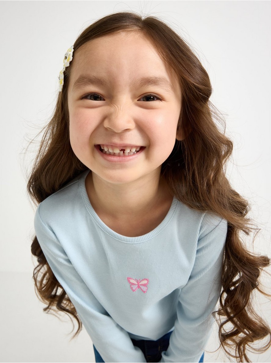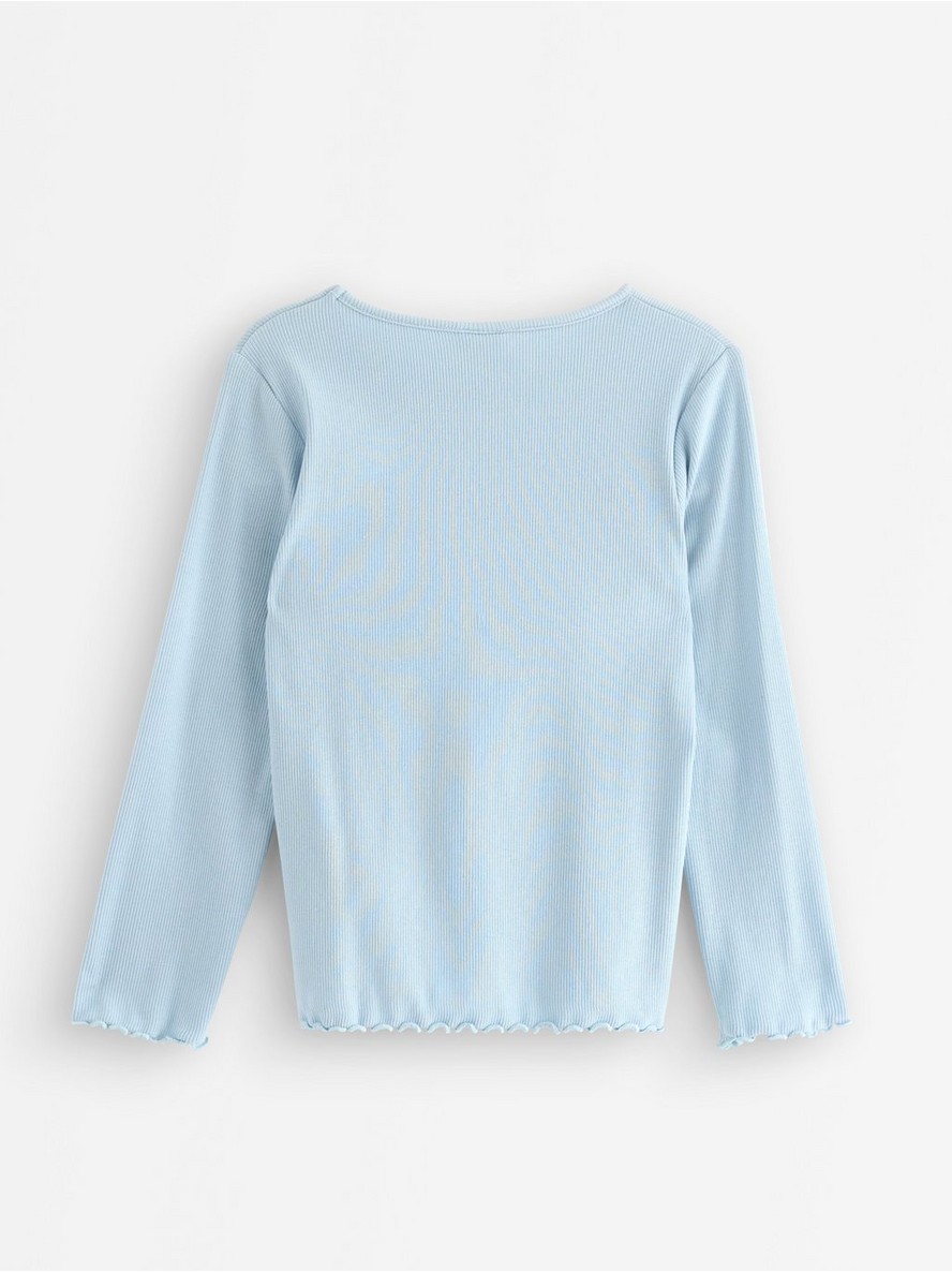 Rebrasti top od mekanog, rastegljivog pamuka, sa ukrasnim volanima i malim vezom napred.