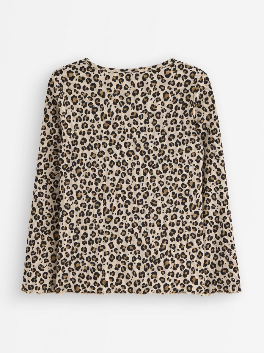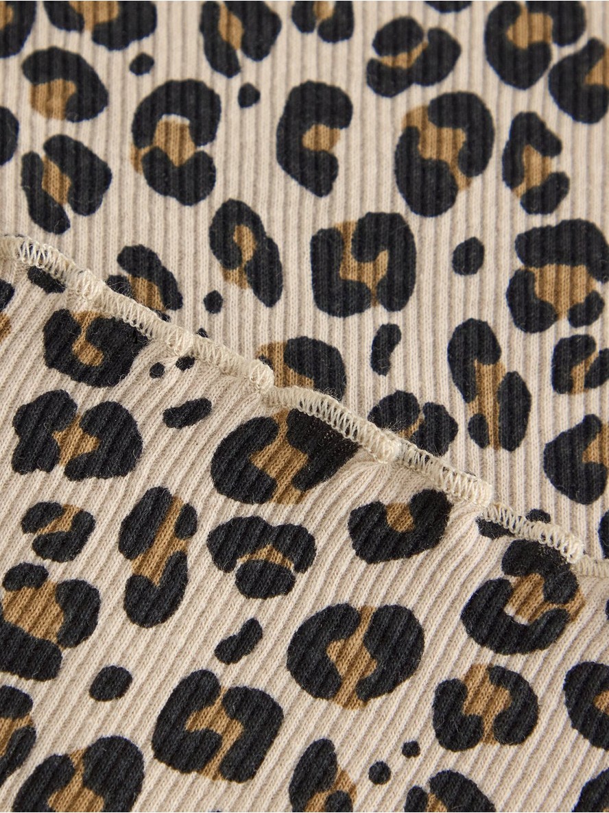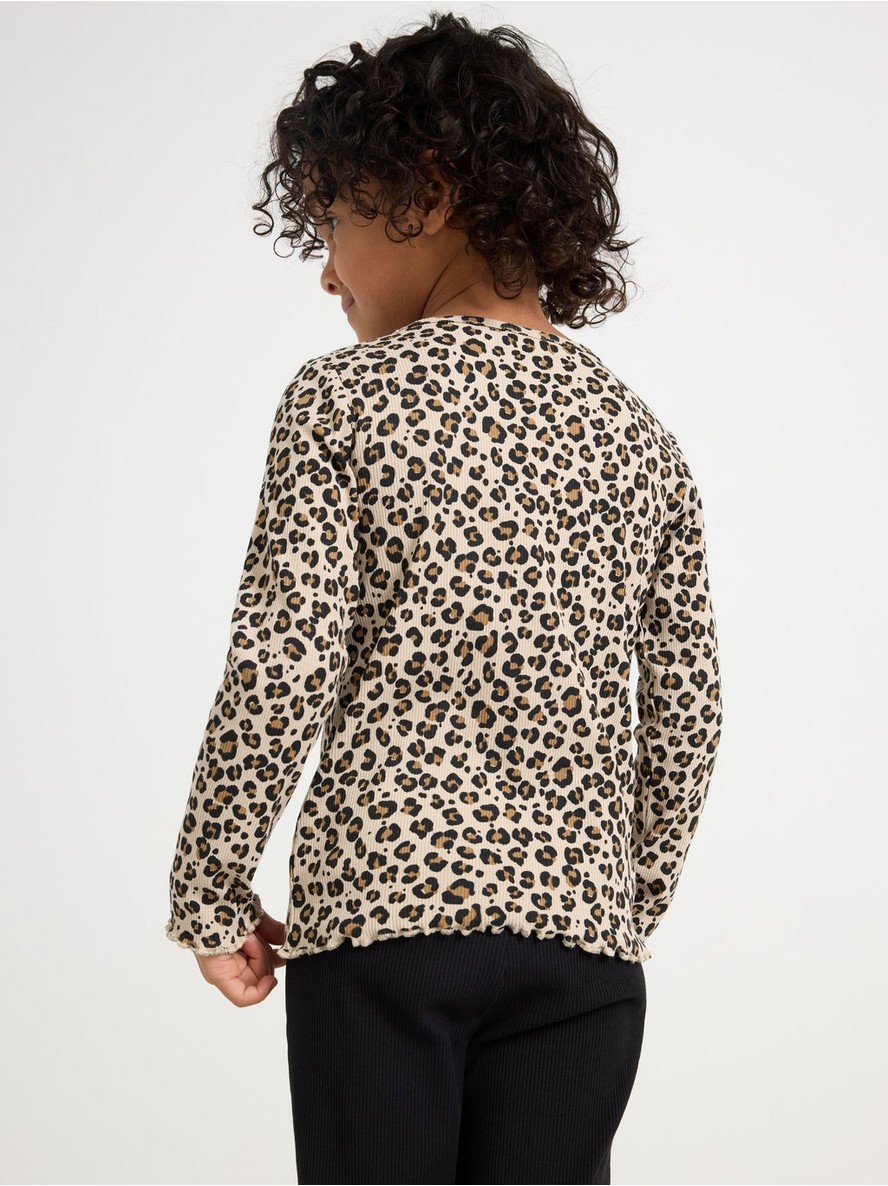 Rebrasti top od mekanog, rastegljivog pamuka sa ukrasnim volanima i uzorkom po celoj površini.