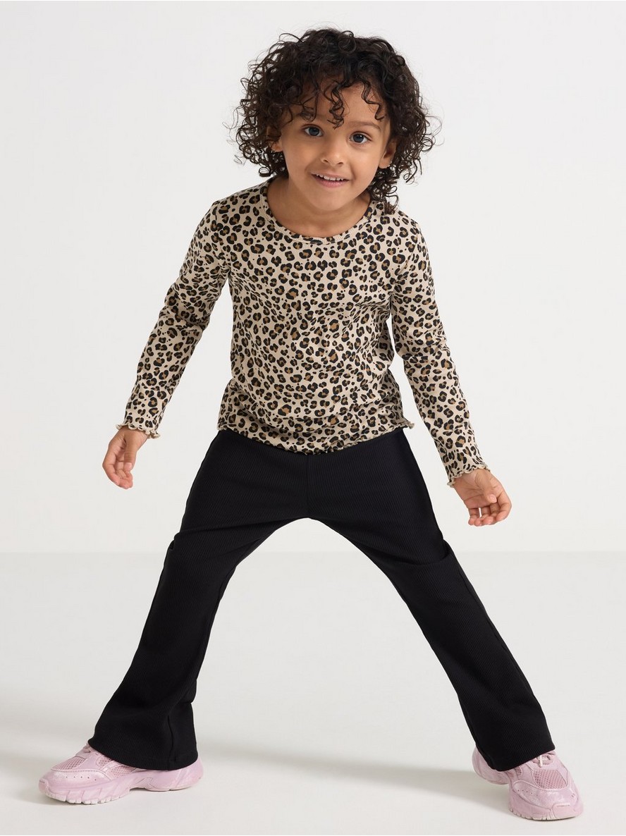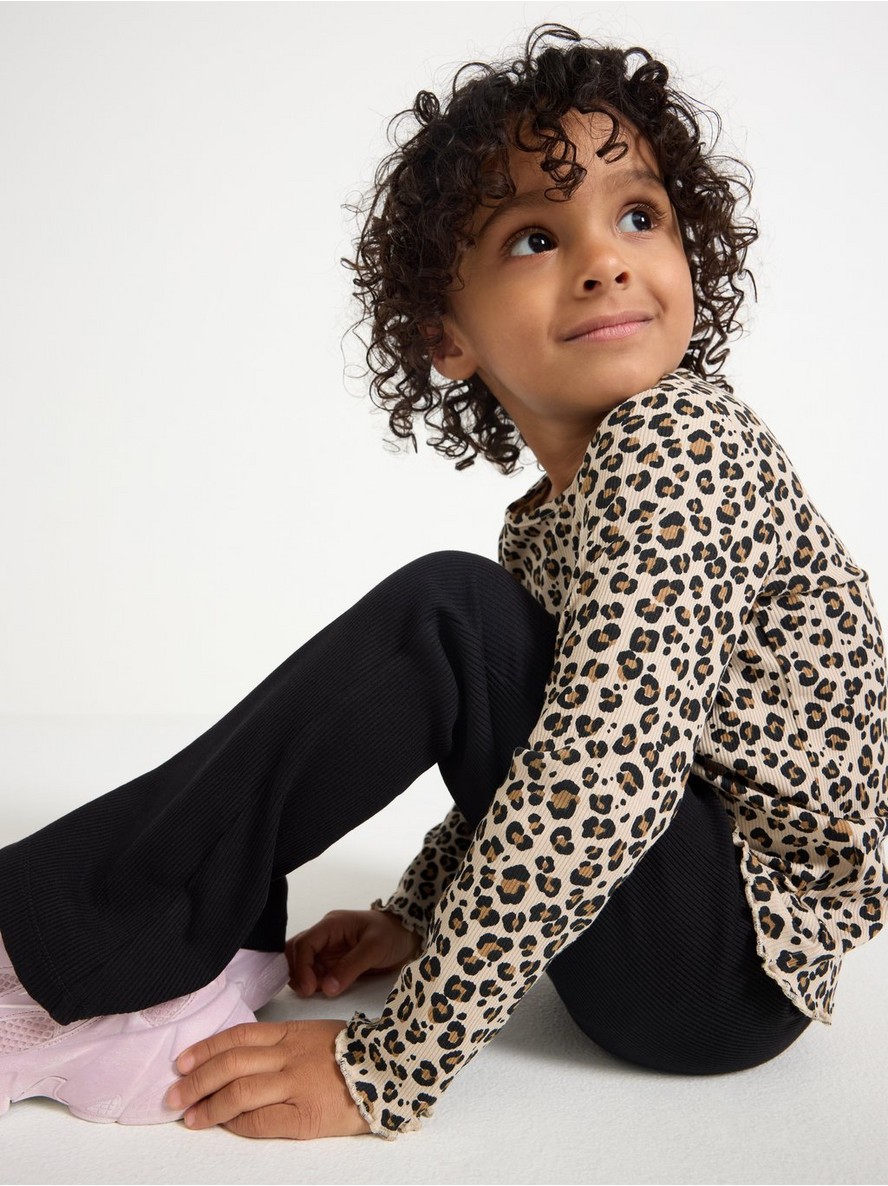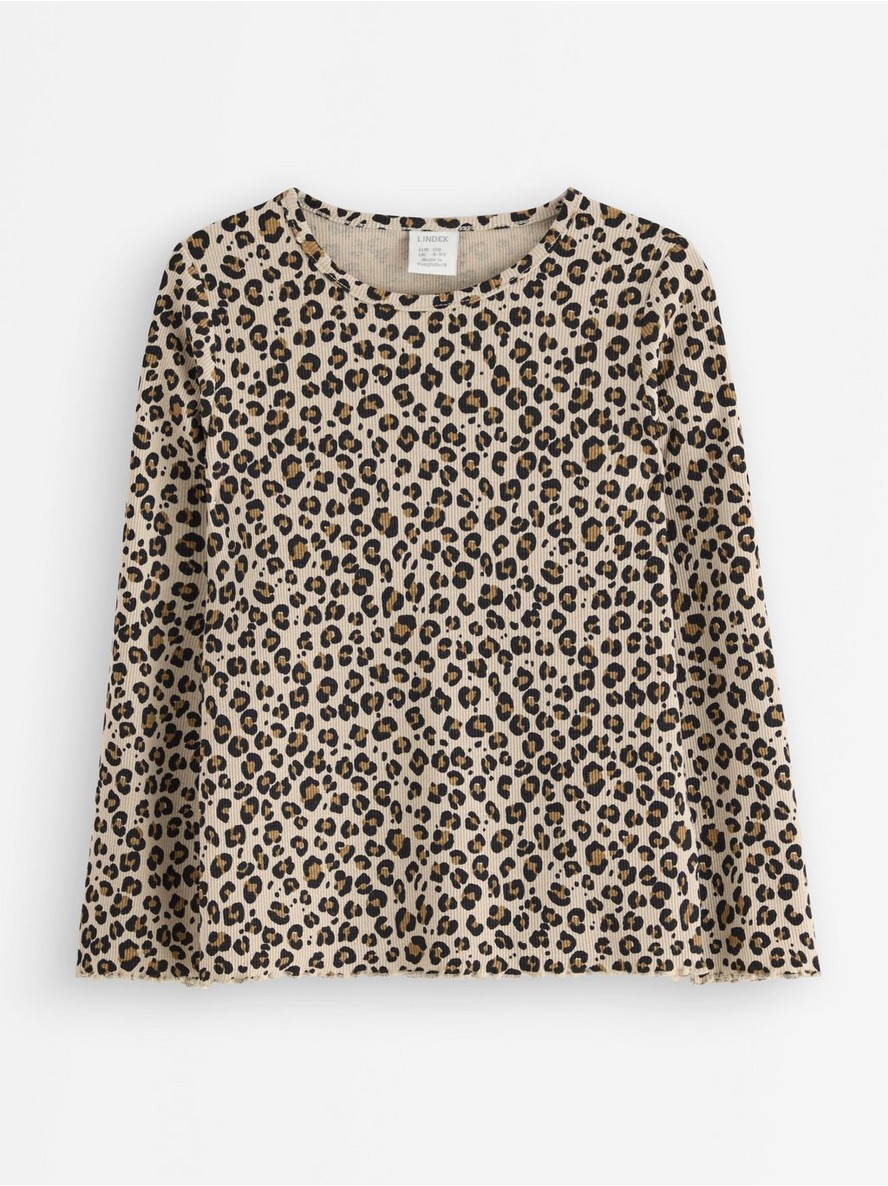 Rebrasti top od mekanog, rastegljivog pamuka sa ukrasnim volanima i uzorkom po celoj površini.