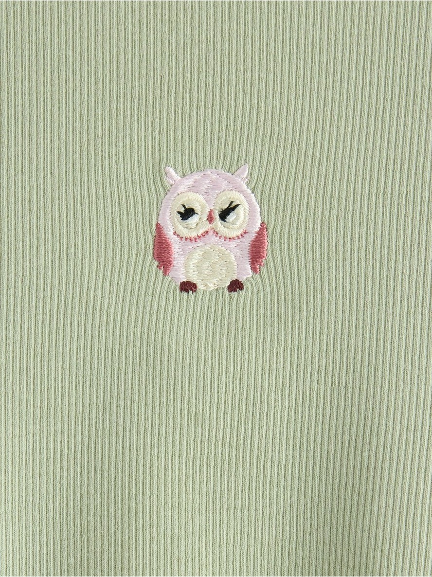Rebrasti top od mekanog, rastegljivog pamuka sa ukrasnim volanima i sitnim vezenim detaljem na prednjem delu.