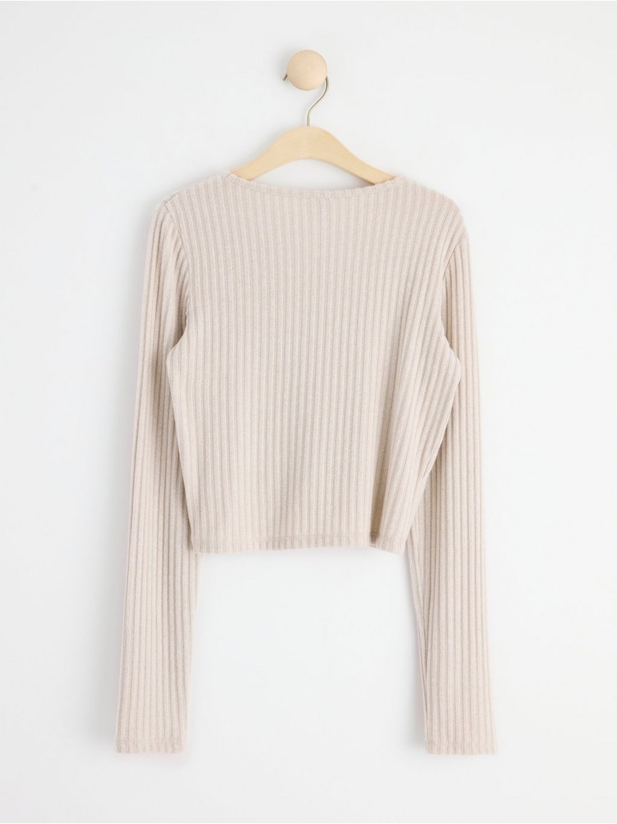 Mekana bluza dugih rukava u mekom rebrastom materijalu, sa naborom na prednjem delu. MATERIJAL. Ovaj komad je delimično napravljen od LENZING™ ECOVERO™, održivije opcije u poređenju sa konvencionalnom viskozom. Materijal potiče iz odgovornog šumarstva i proizvodi se uz manji uticaj na životnu sredinu.