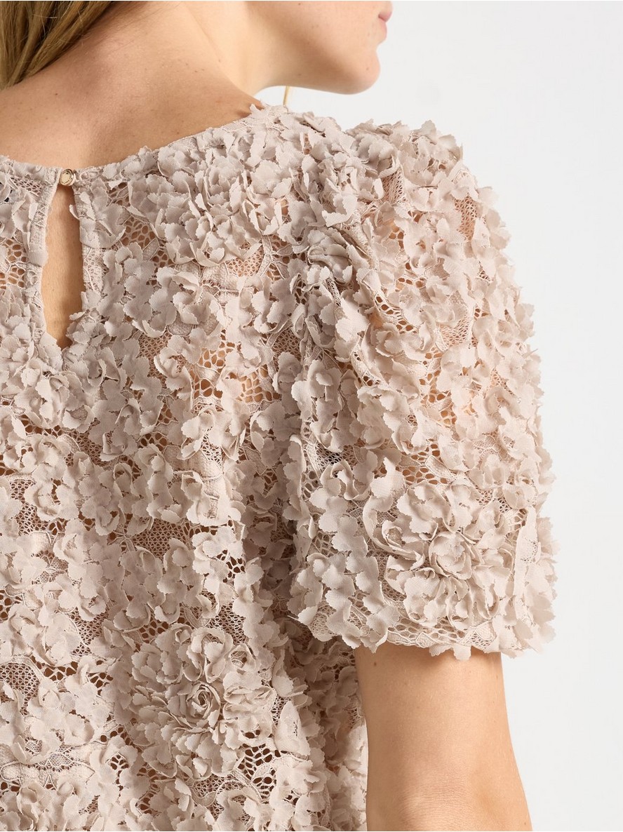 Moderan top kratkih rukava sa cvetnim motivom i mrežastim umetkom.