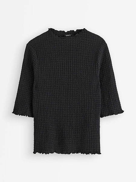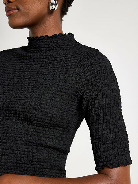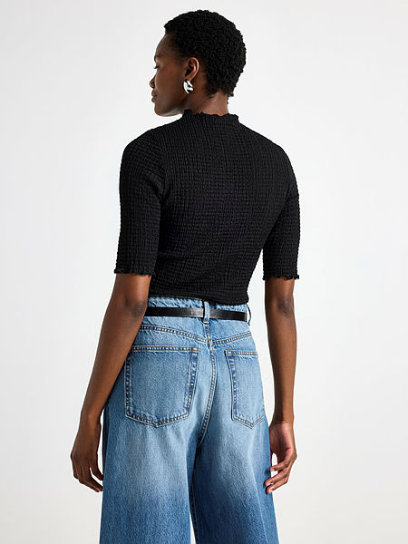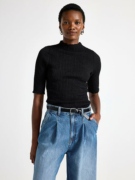 Crinkled short-sleeved top with a high neckline.