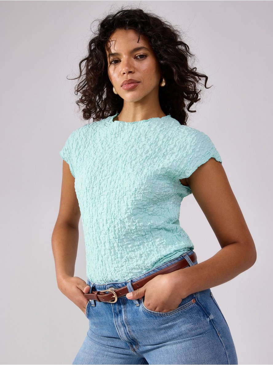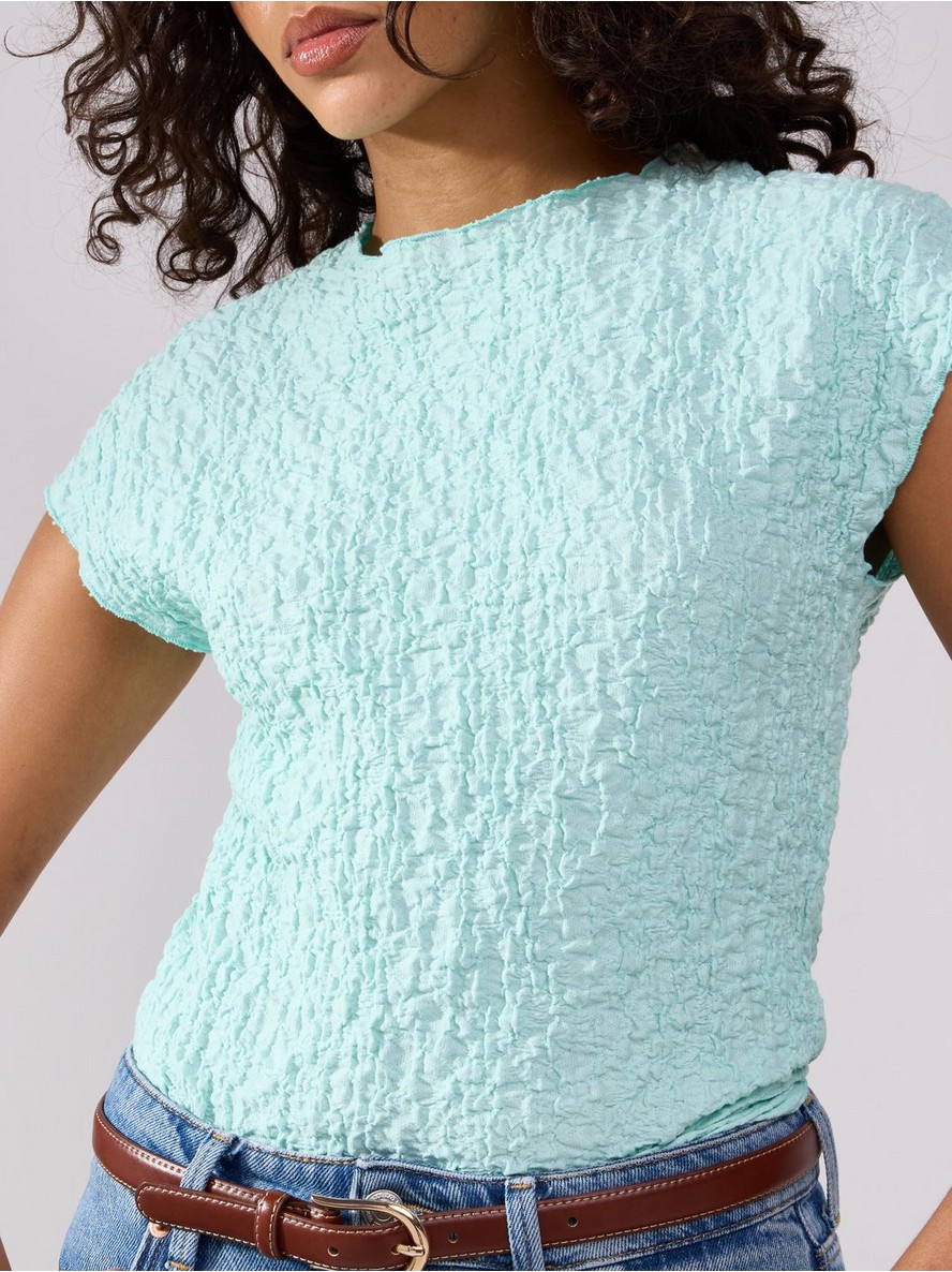 Top kratkih rukava od džerseja sa teksturom mehurića i okruglim izrezom.