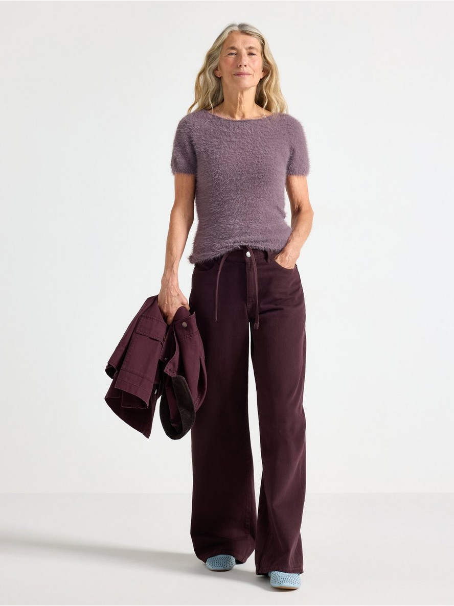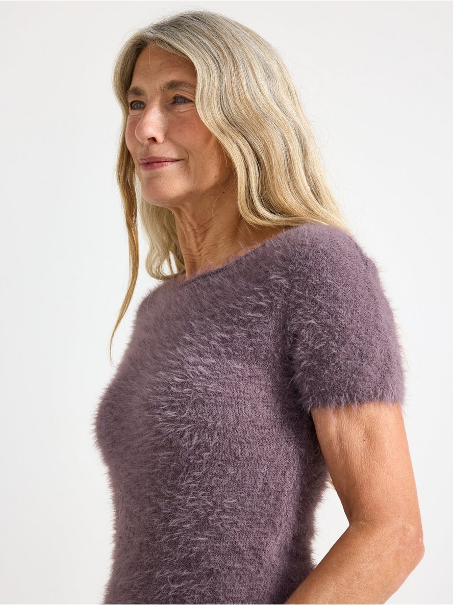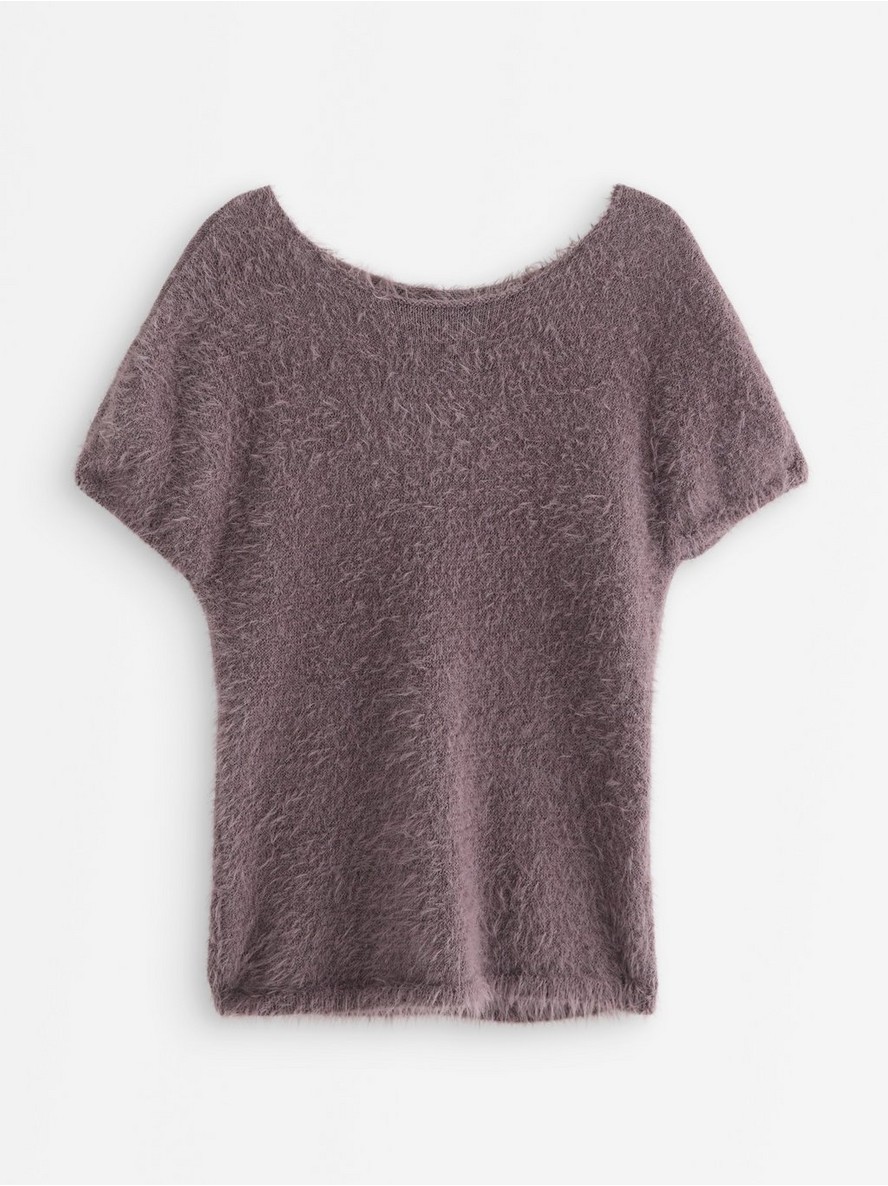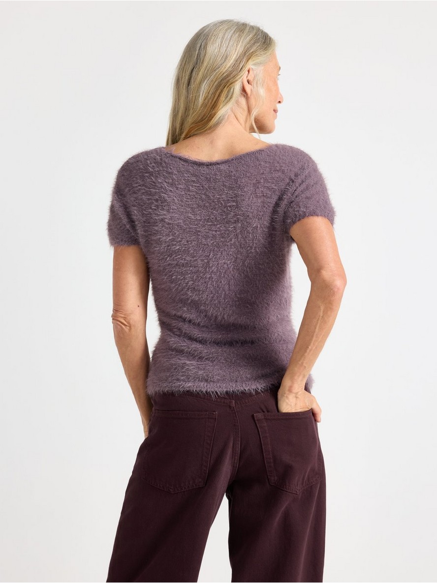 Pleteni top od mekane paperjaste pređe sa strukiranim krojem i kratkim rukavima.