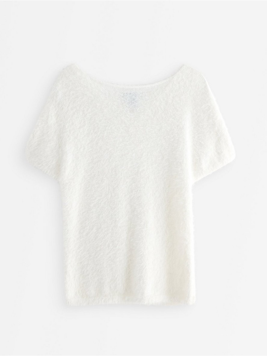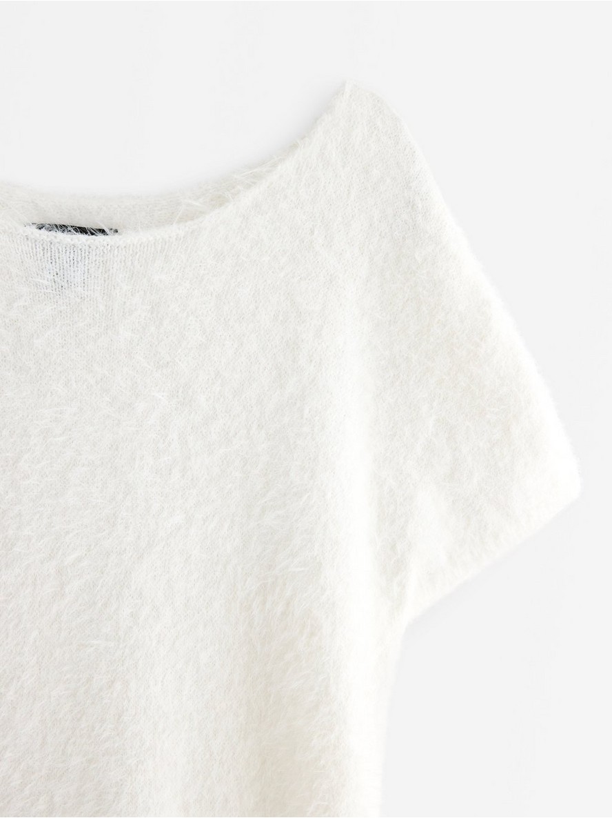 Pleteni top od mekog prediva s efektom perja, sa prilegajućim strukom i kratkim rukavima.