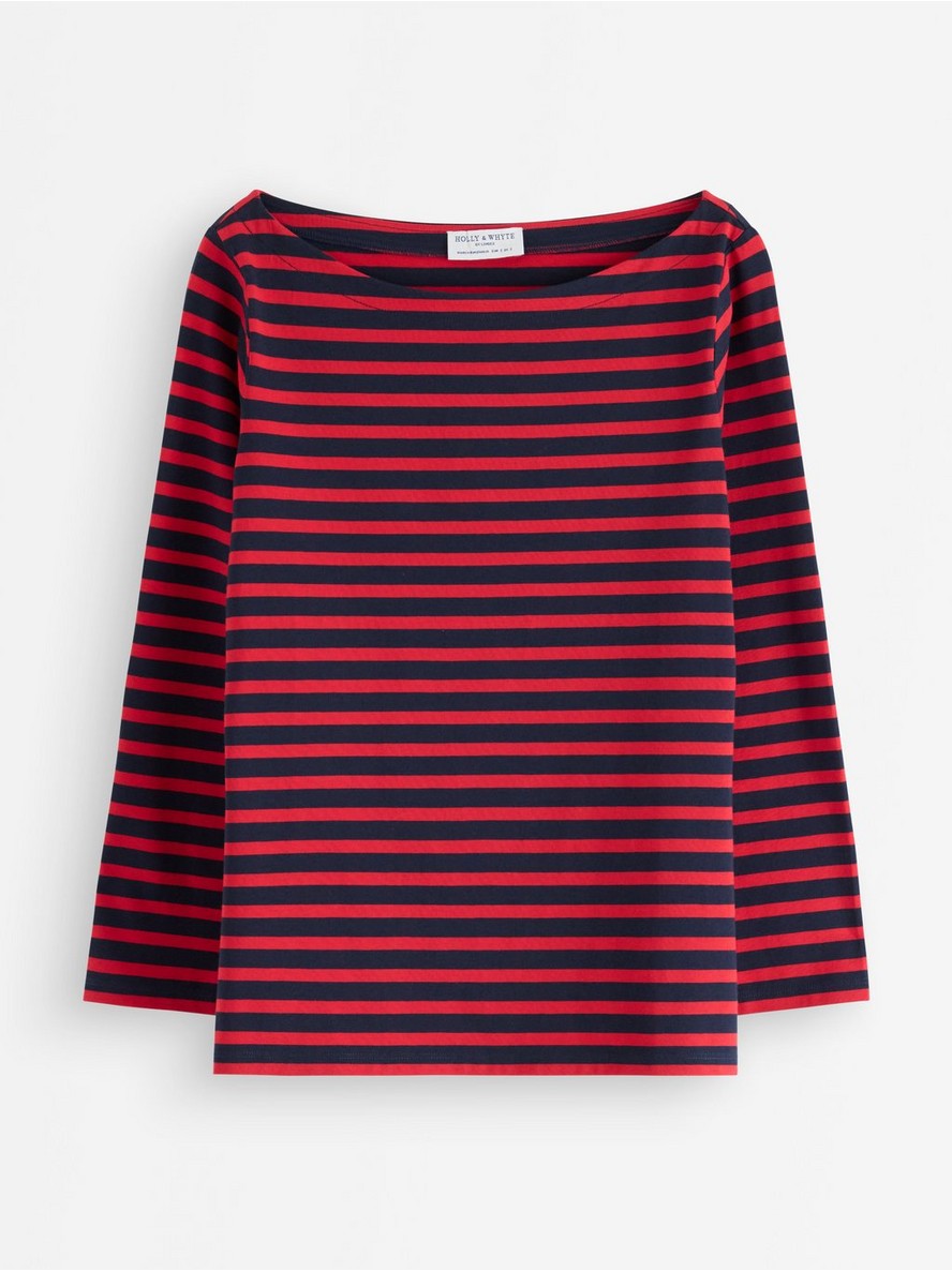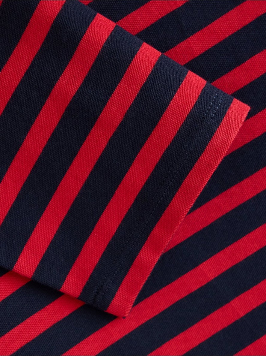 Izuzetno mekan i udoban top od organskog pamuka sa okruglim izrezom, blago skraćenim rukavima i klasičnim prugastim dezenom.