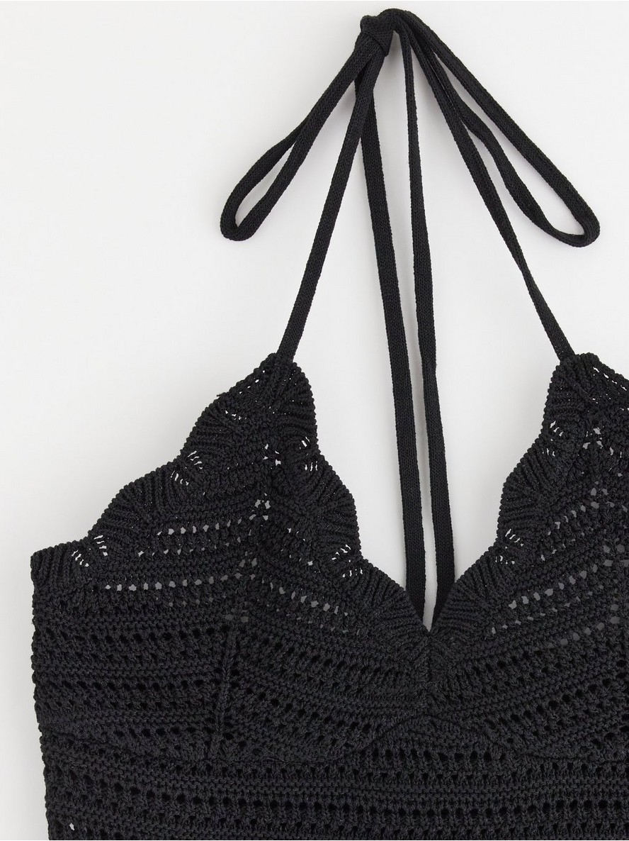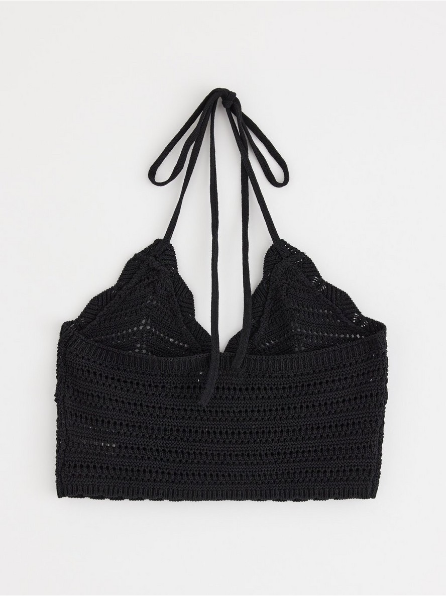Pleteni top sa efektom kukičanja, sa trakama za vezivanje na leđima i skraćenom siluetom.