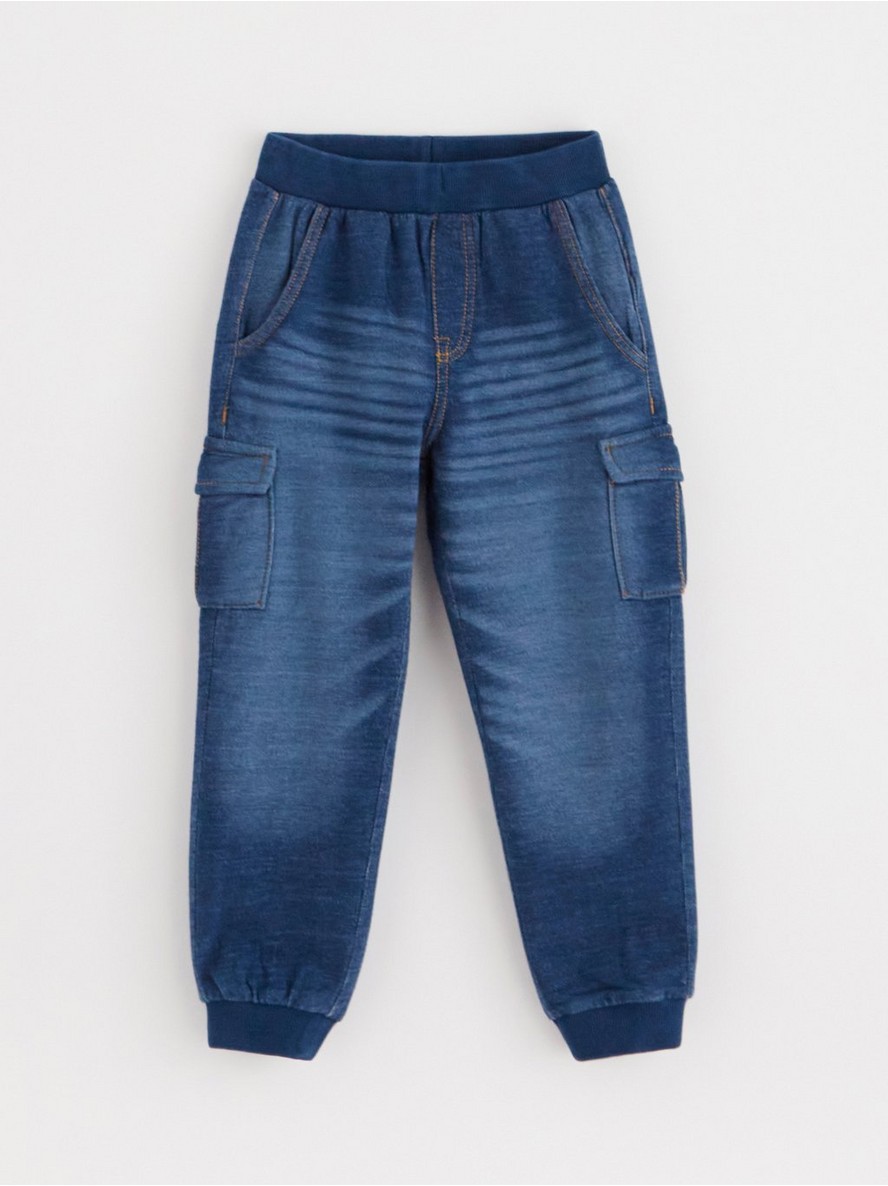 Meke, udobne cargo pantalone od pamučnog džerseja sa džins izgledom i bočnim džepovima. Cargo pantalone imaju elastičan i podesiv pojas, kao i rebrasti rub nogavica.