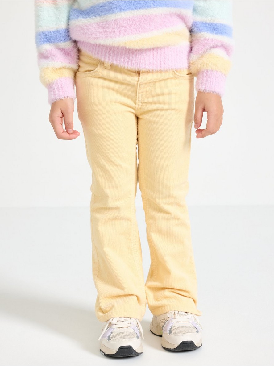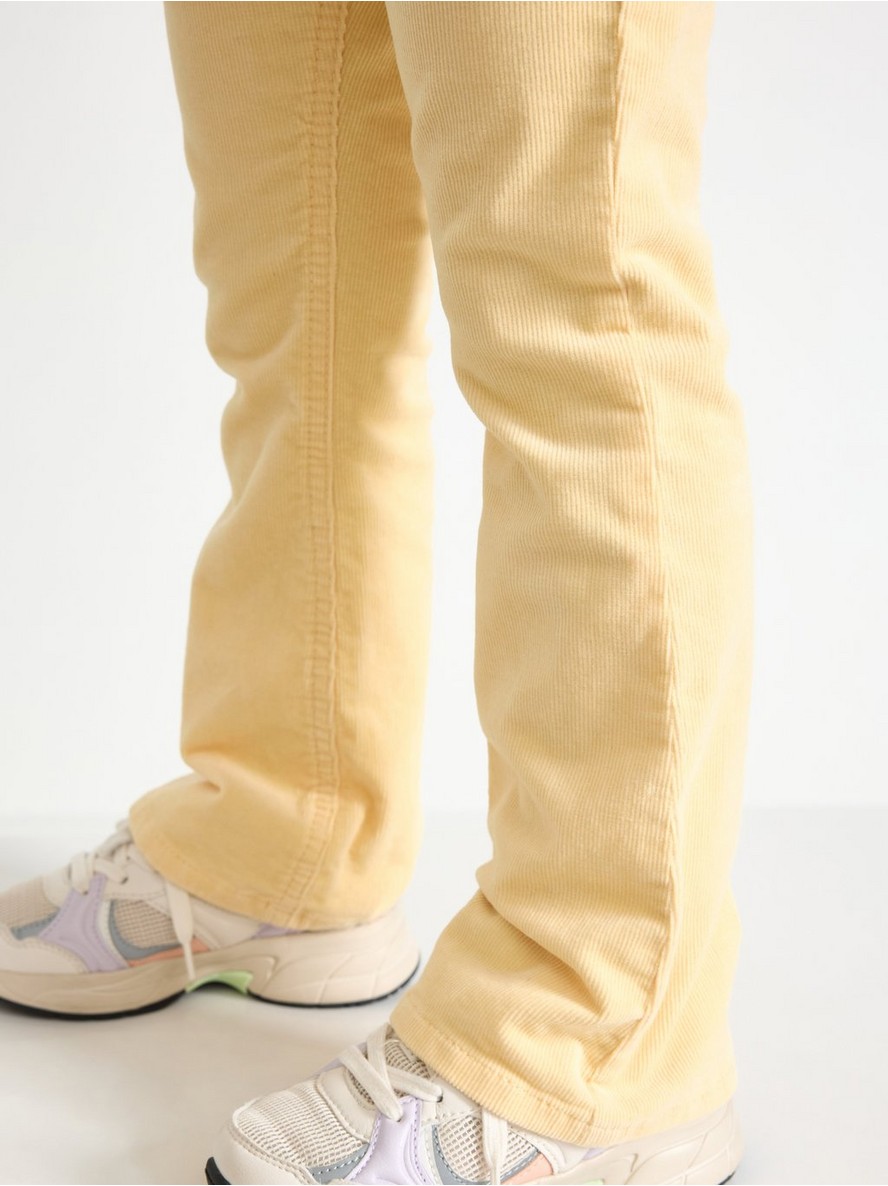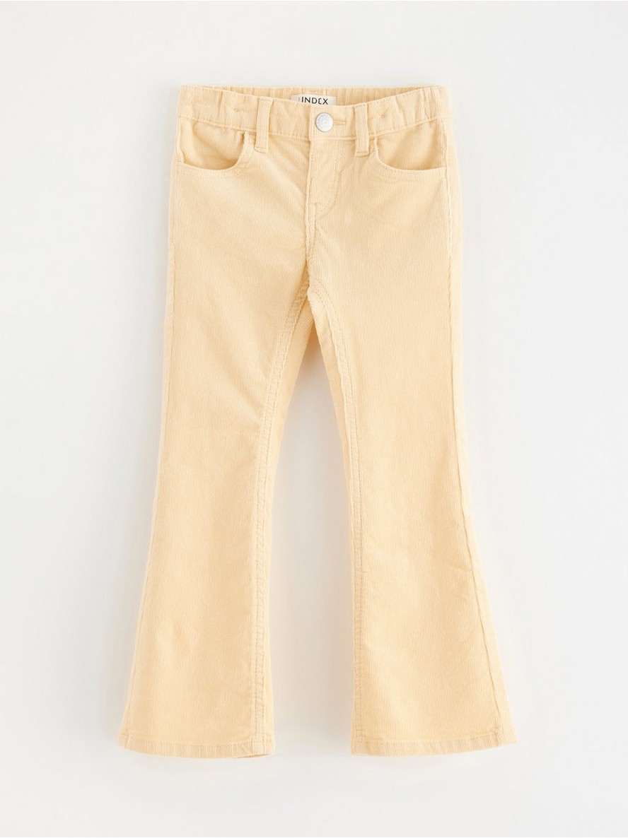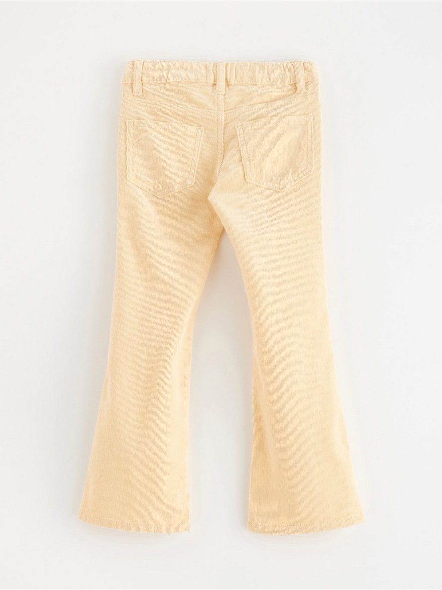 Mekane i udobne pantalone od somota sa zvonastim nogavicama i elastičnim, podesivim strukom.
