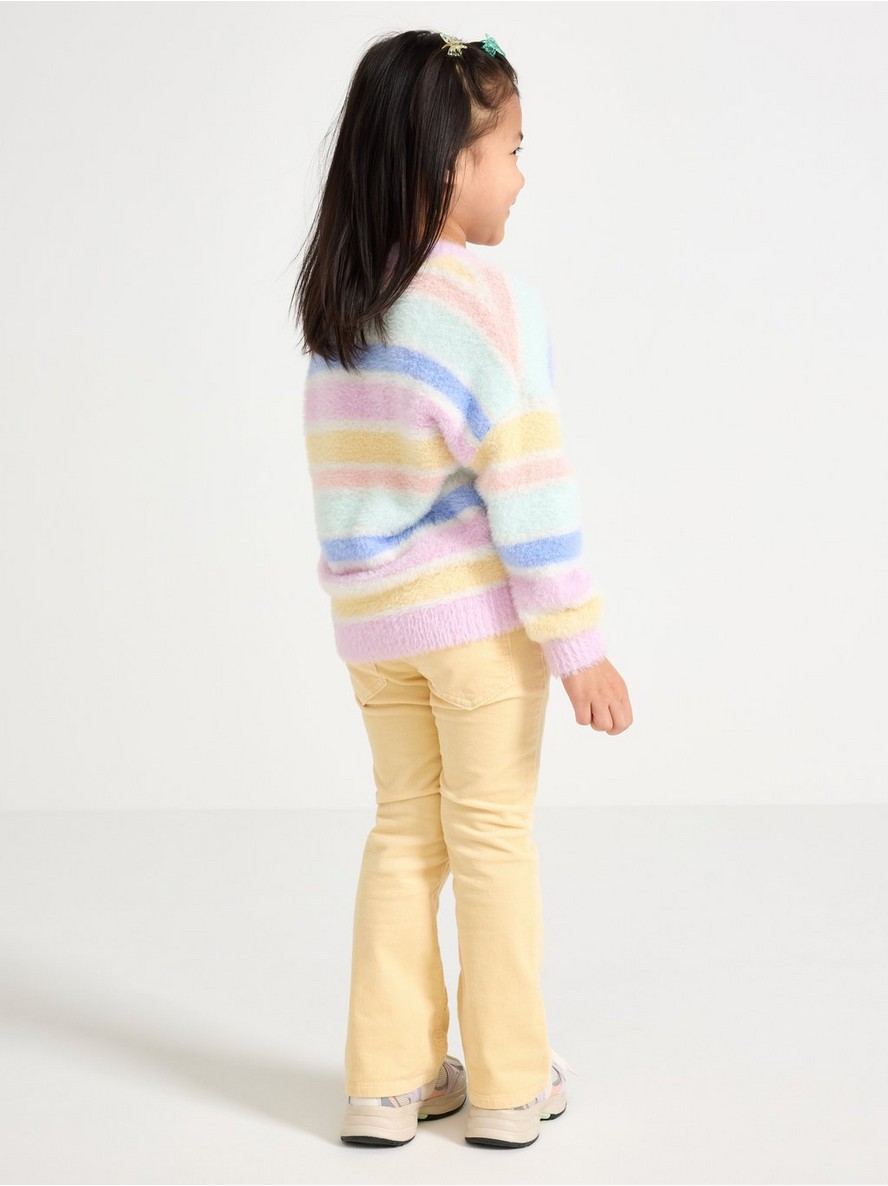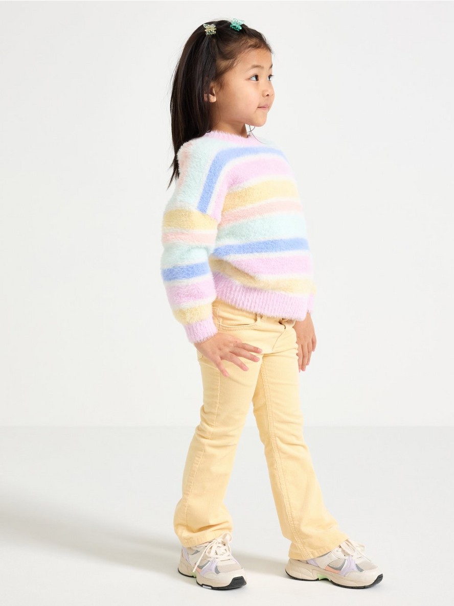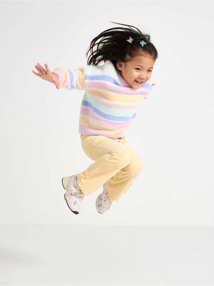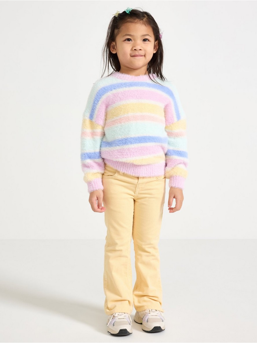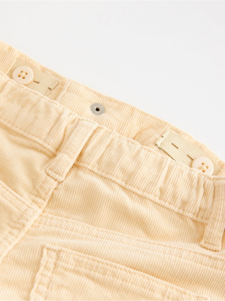 Mekane i udobne pantalone od somota sa zvonastim nogavicama i elastičnim, podesivim strukom.
