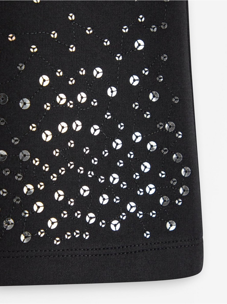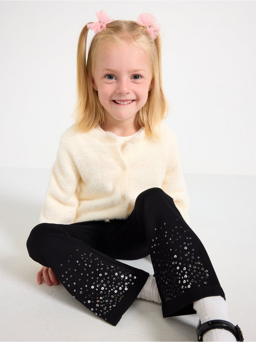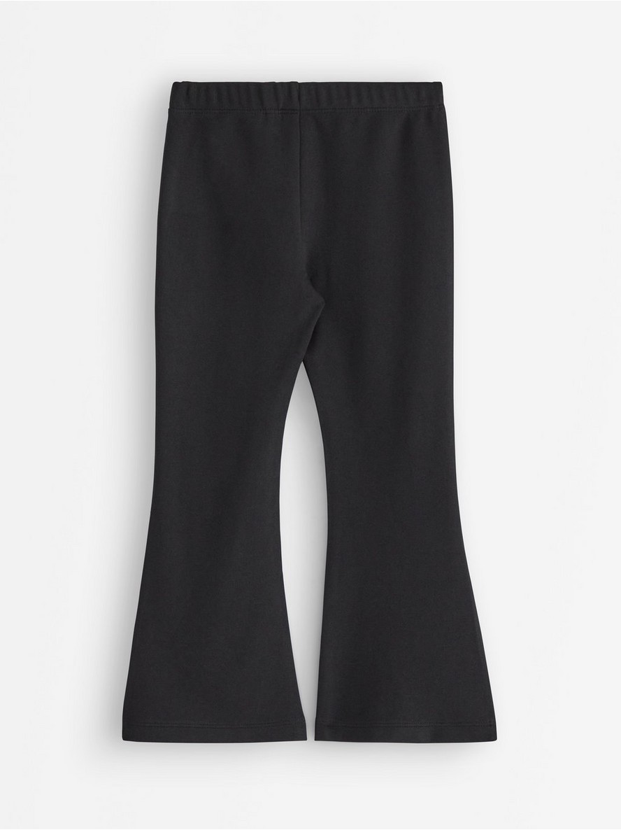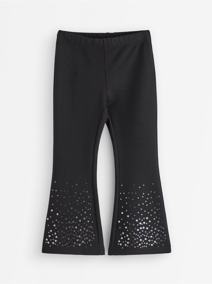 Udobne džerse pantalone od mekanog punto materijala, sa elastičnim strukom i zvonastim nogavicama ukrašenim šljokicama na dnu.