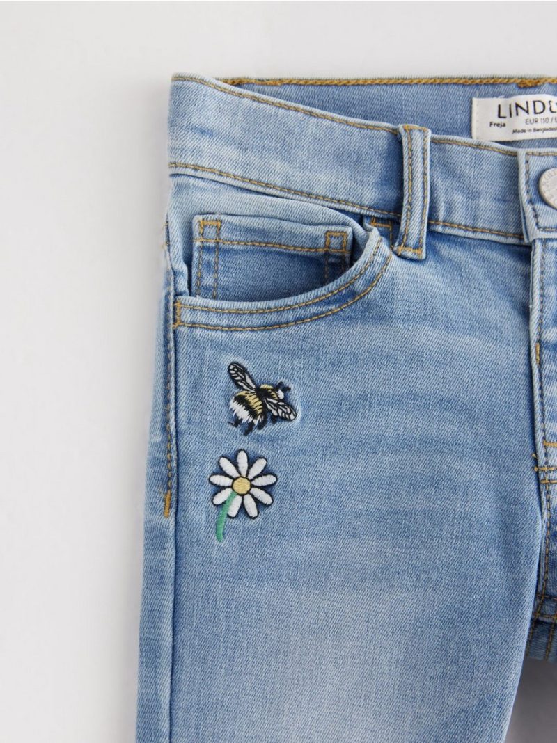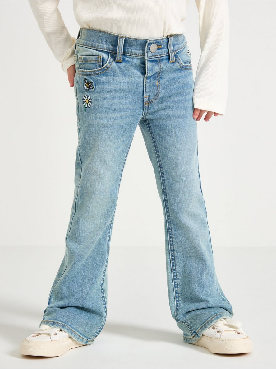 Elastične farmerke od pamučnog denima sa zvonastim nogavicama, podesivim strukom i izvezenim detaljima.