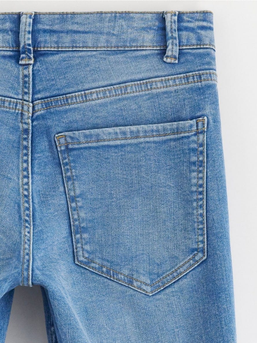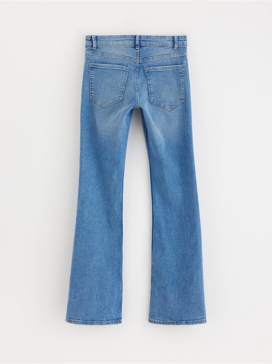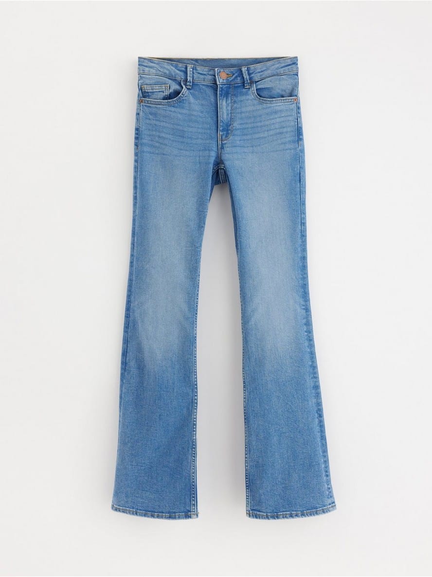 Elastične farmerke sa zvonastim nogavicama i standardnim strukom.