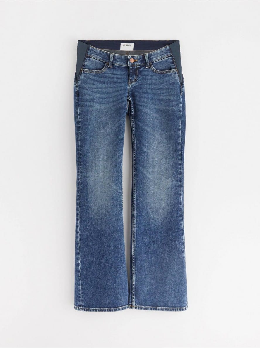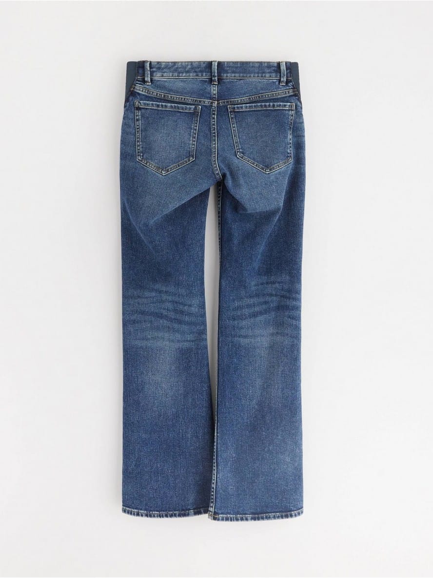 Elastične trudničke farmerke sa elastičnim panelima sa strane i zvonastim nogavicama.