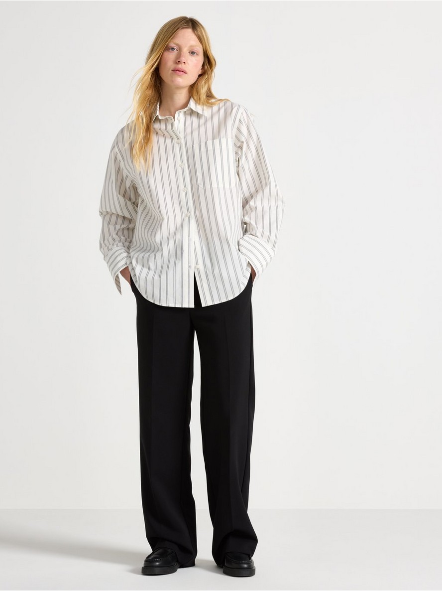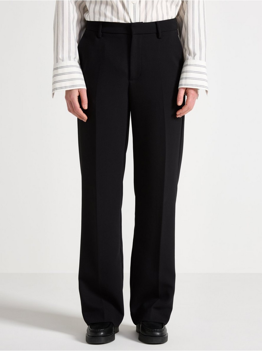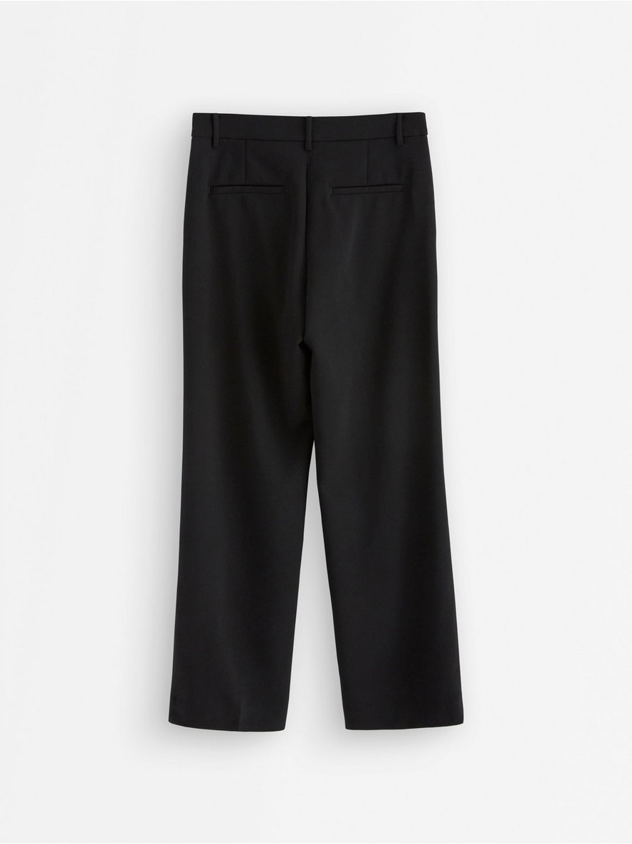 Moderne pantalonе sa ravnim krojem, standardnim strukom i naborima napred i pozadi.