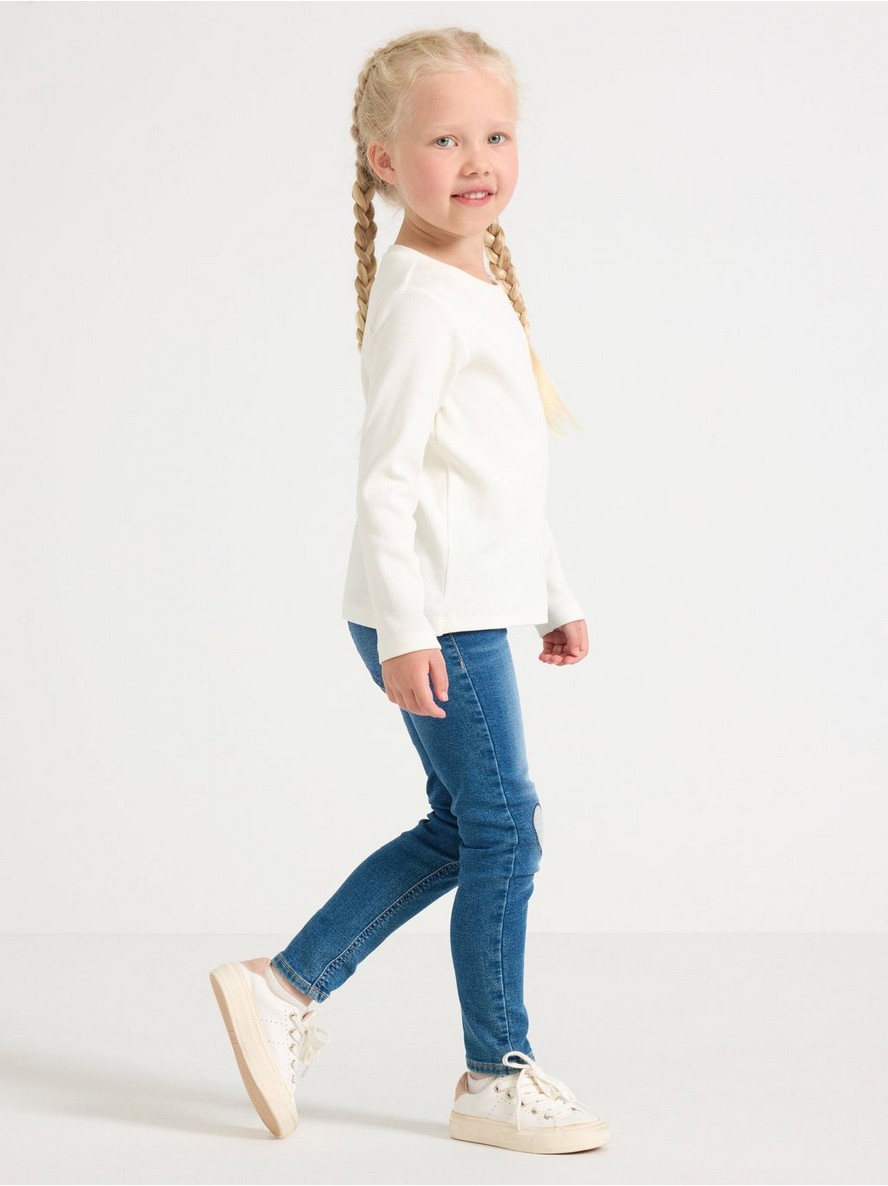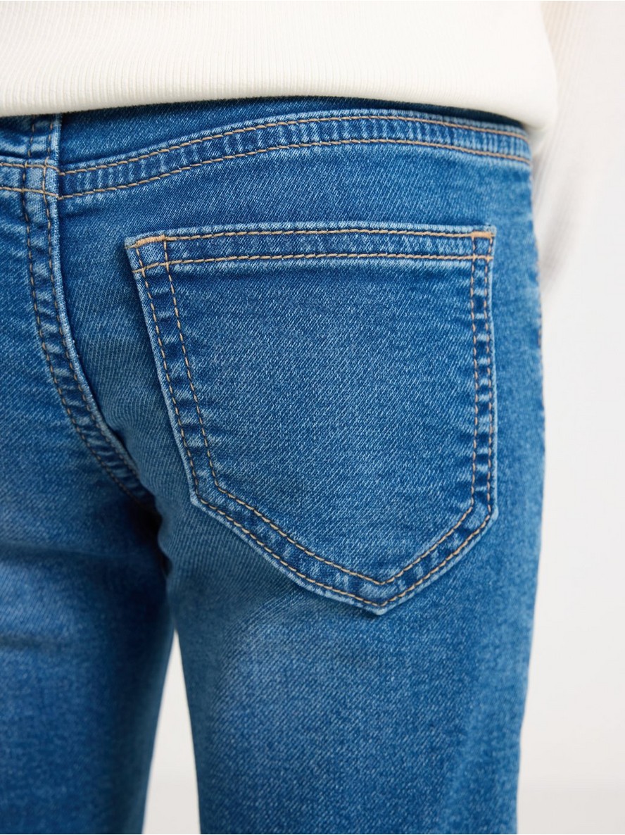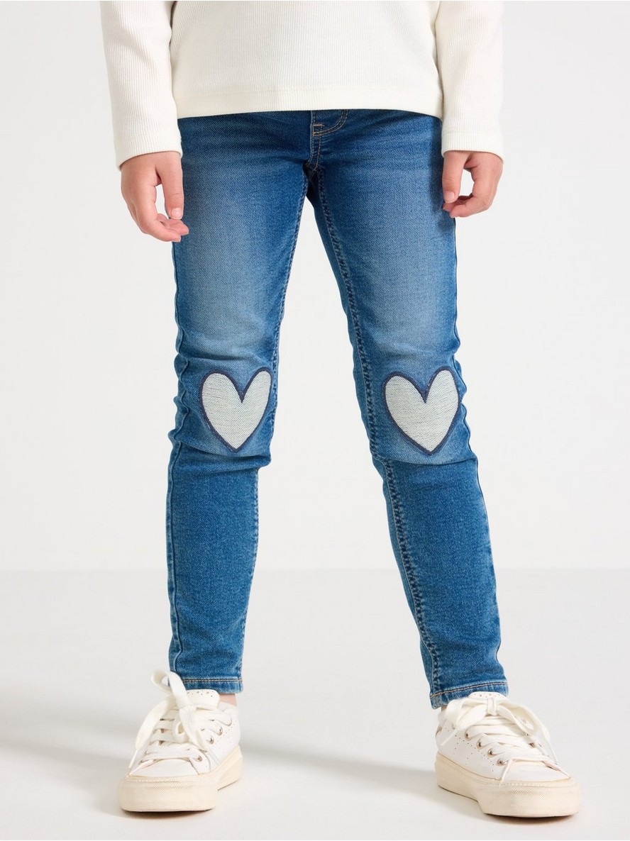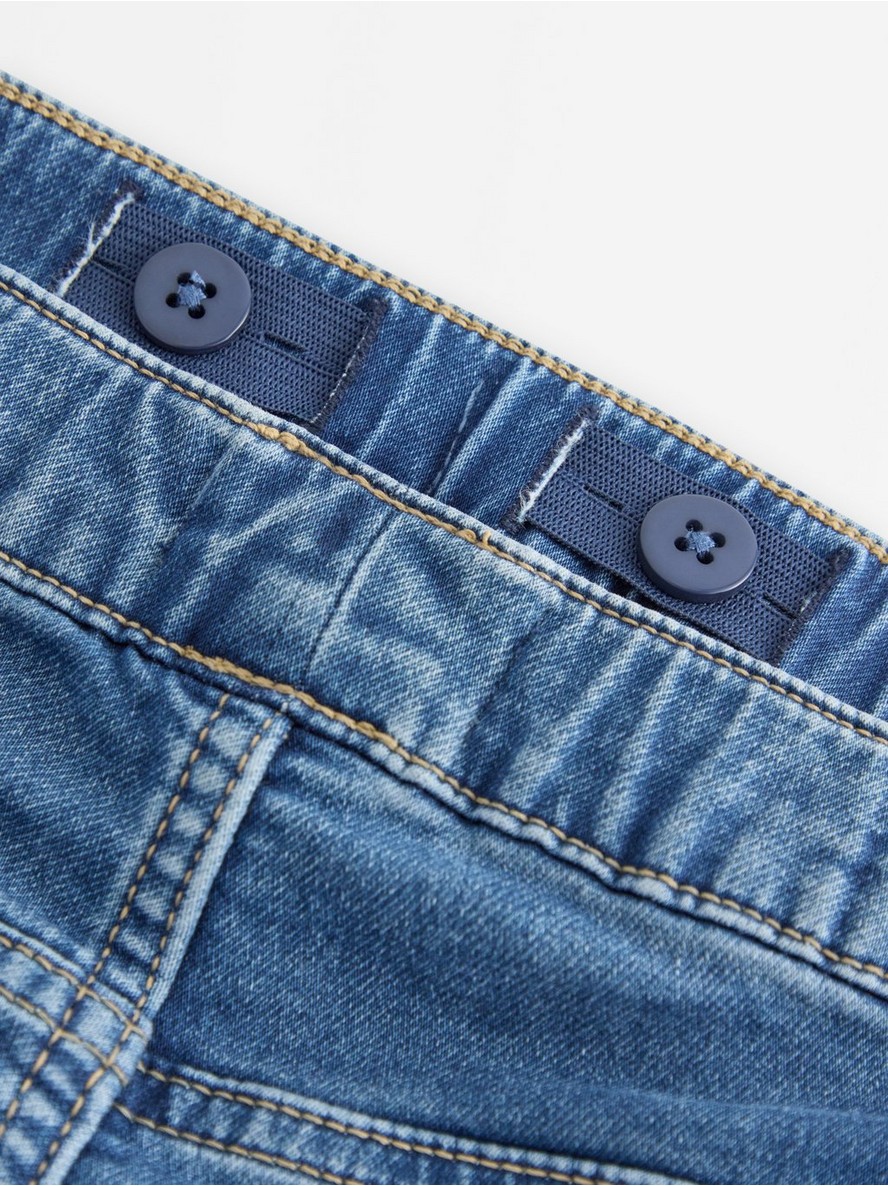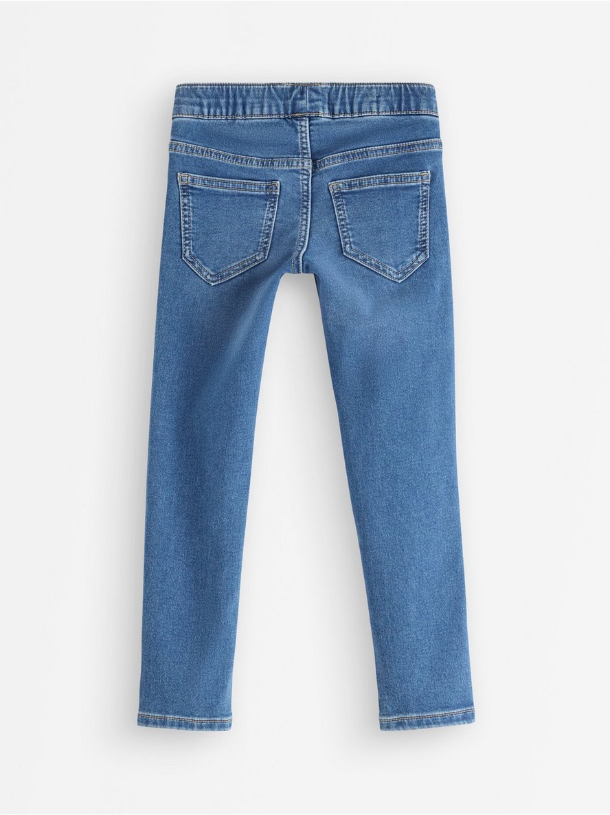 Meke pantalone od teksas džerseja sa prišivanim zakrpama na kolenima. Model koji se navlači čini ih izuzetno lakim za oblačenje i skidanje.