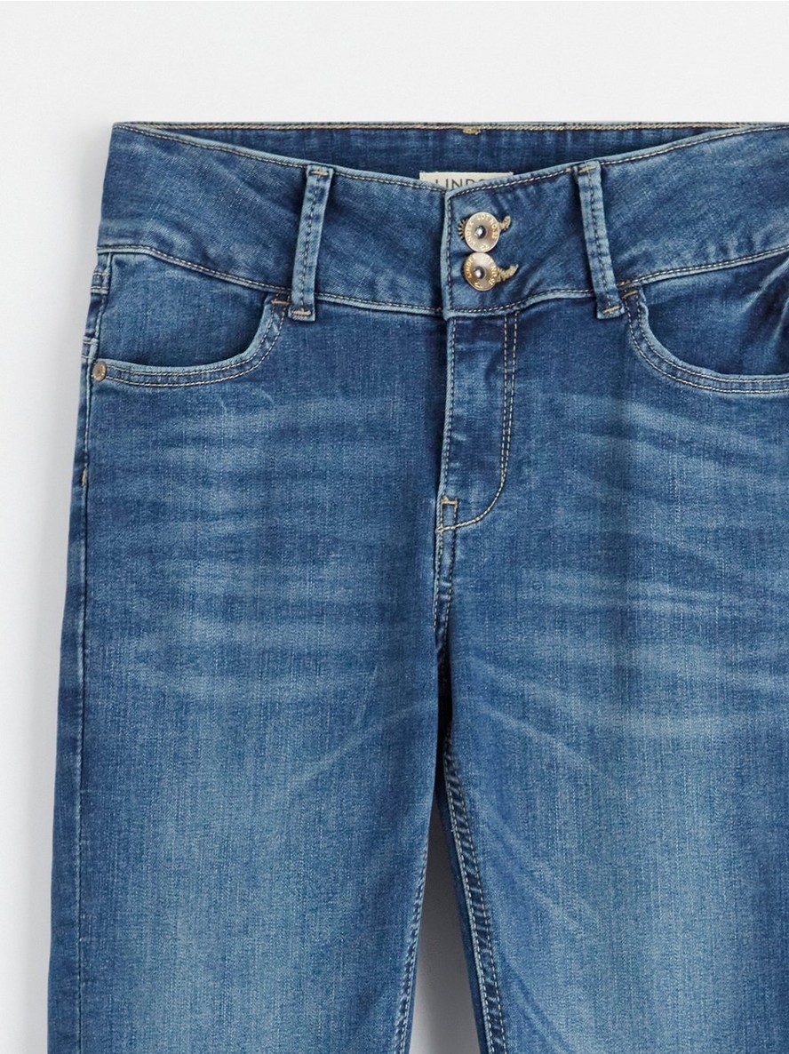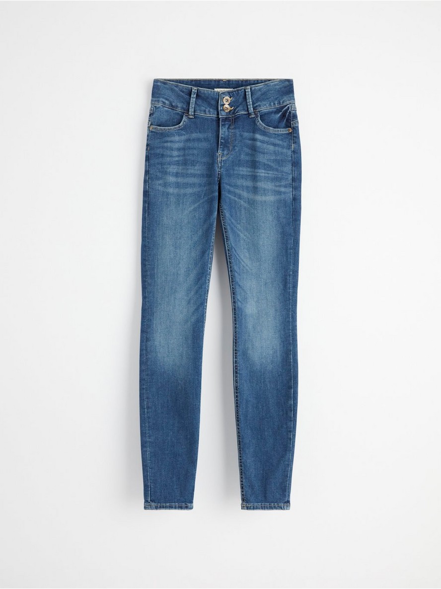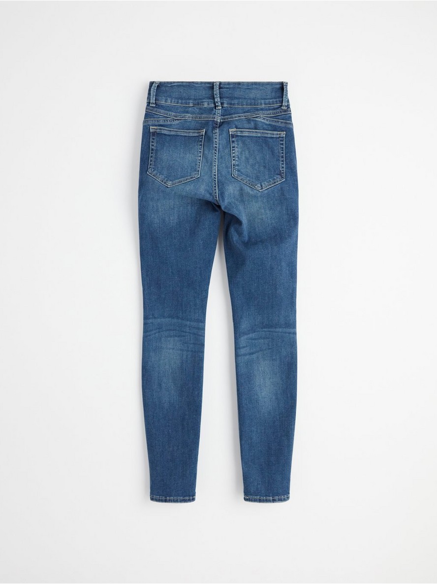 Farmerke srednjeg struka od pamučnog denima, izuzetno rastezljive i sa uskim nogavicama.