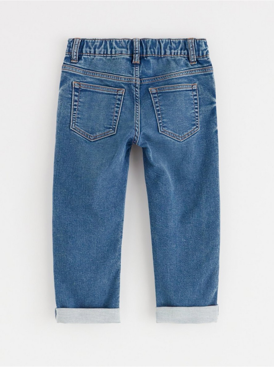 Udobne i veoma rastegljive farmerke od mekog džins-džerseja, sa ravnom nogavicom i klasičnim, podesivim strukom.