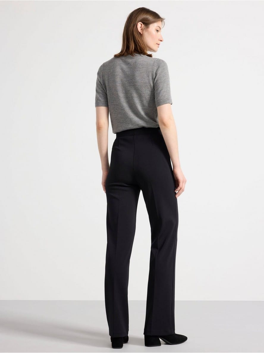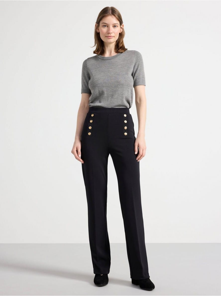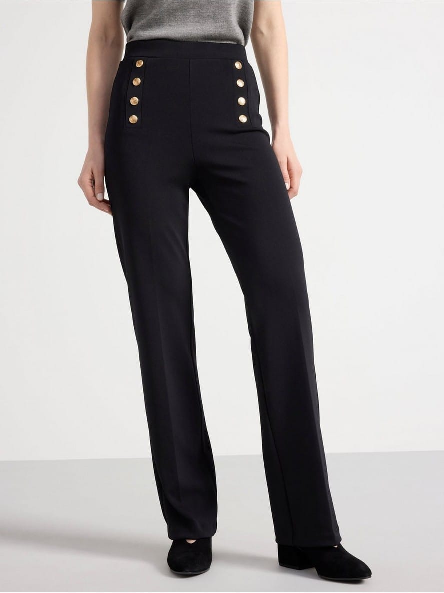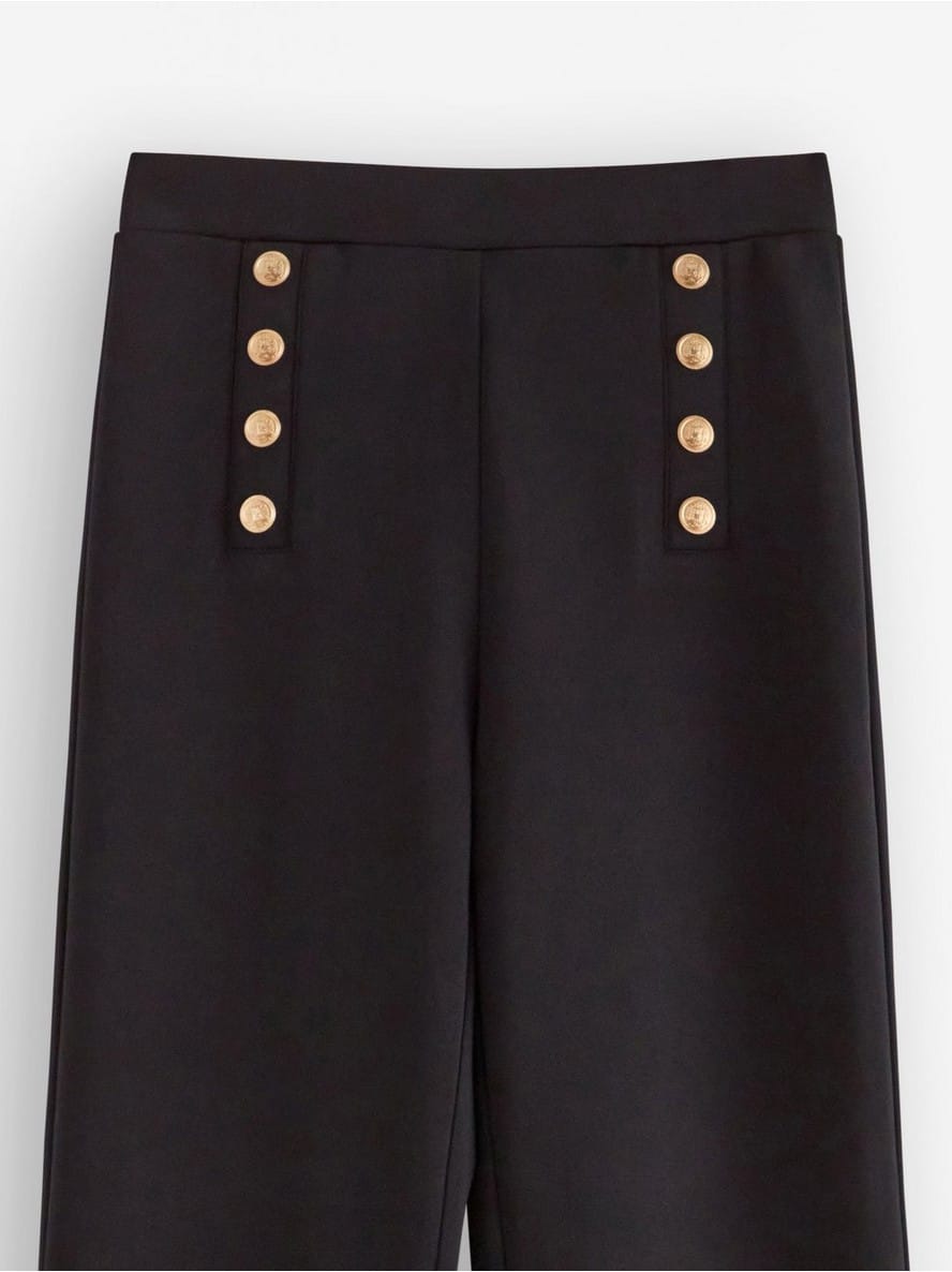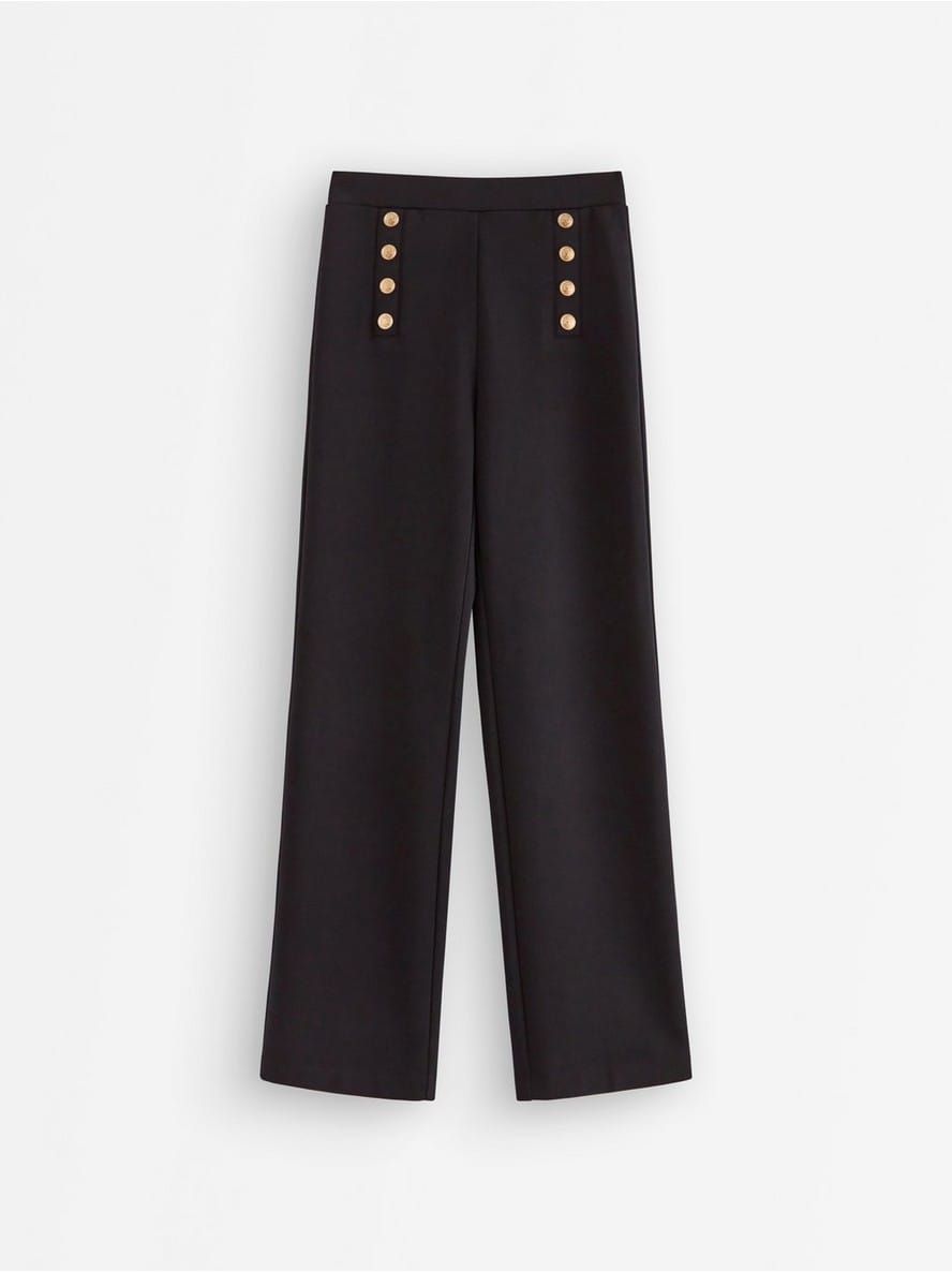 Preppy, rastegljive pantalone sa ravnim krojem i standardnom visinom struka. Pantalone imaju zlatne dugmiće.
